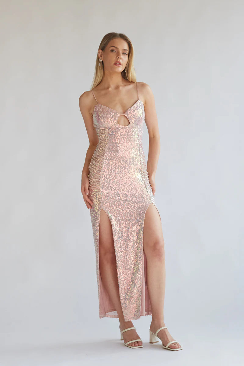 The Adelaide Sequin Keyhole Midi Dress will put you in the party mood! This glam dress features sparkling iridescent sequins, a keyhole bustier-style top, bodycon silhouette, adjustable spaghetti straps, ruched sides, and two side slits. Finish off the look with your favorite !
