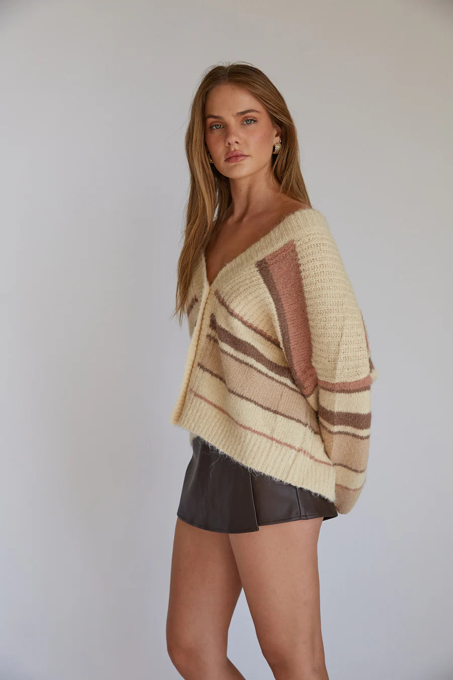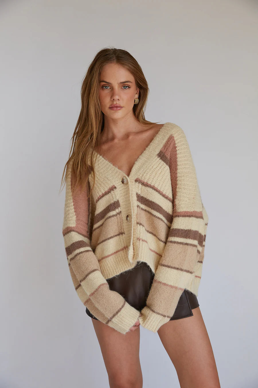 Snuggle up in the all new Alden Stripe Knit Button Up Cardigan! This sweater features a soft, plush knit fabrication, slouchy fit, and unique striped pattern. Available in Neutral Multi; style with your favorite to complete the look!