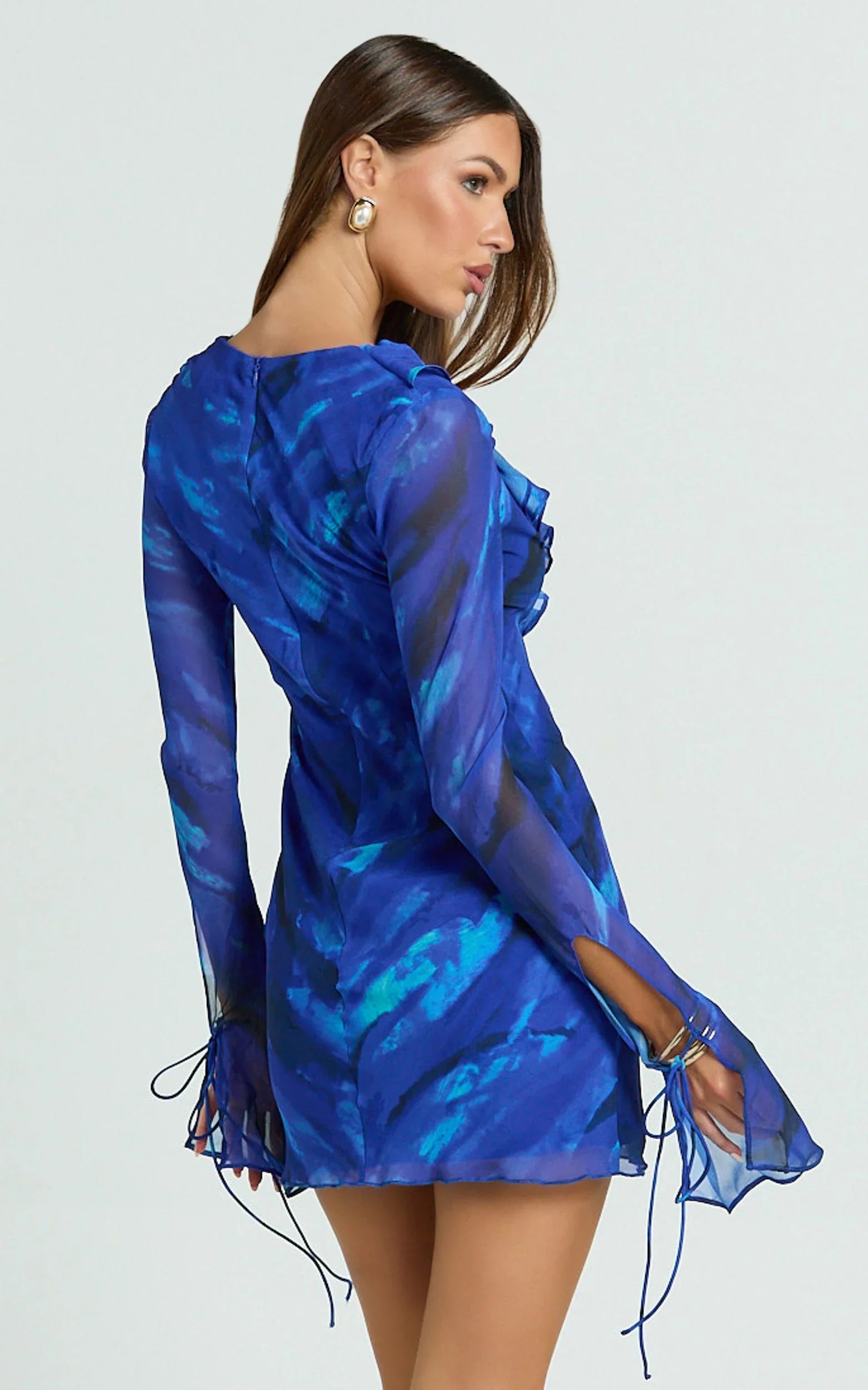 This playful blue abstract number features a plunging ruffle neckline and dreamy long sleeves accented by delicate tie details, making it perfect for your next soirée or brunch date. Lean into the dopamine dressing trend by pairing this statement piece with oversized layers, like a slouchy blazer or a chunky knit cardigan, to effortlessly blend glamorous flair with relaxed charm.