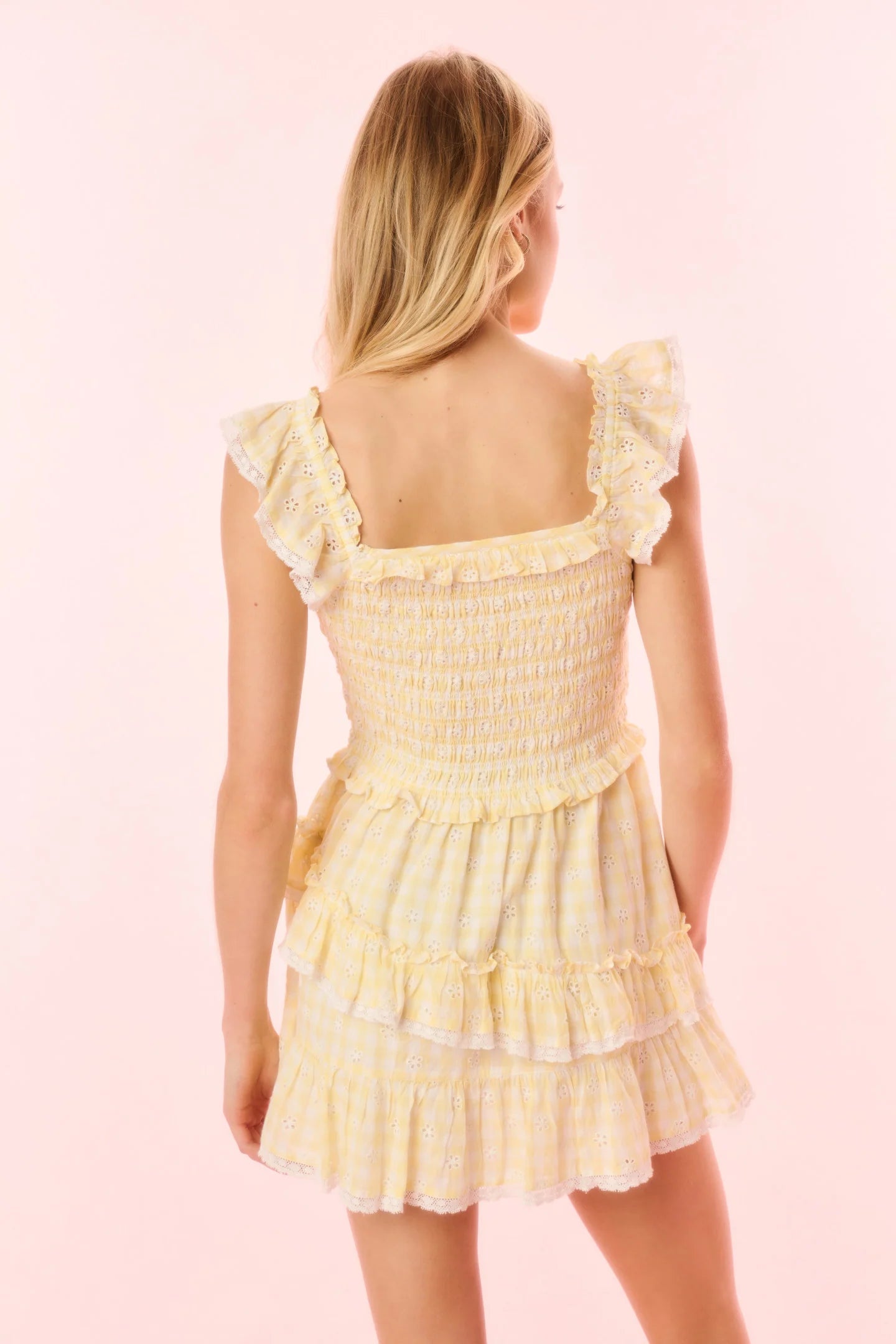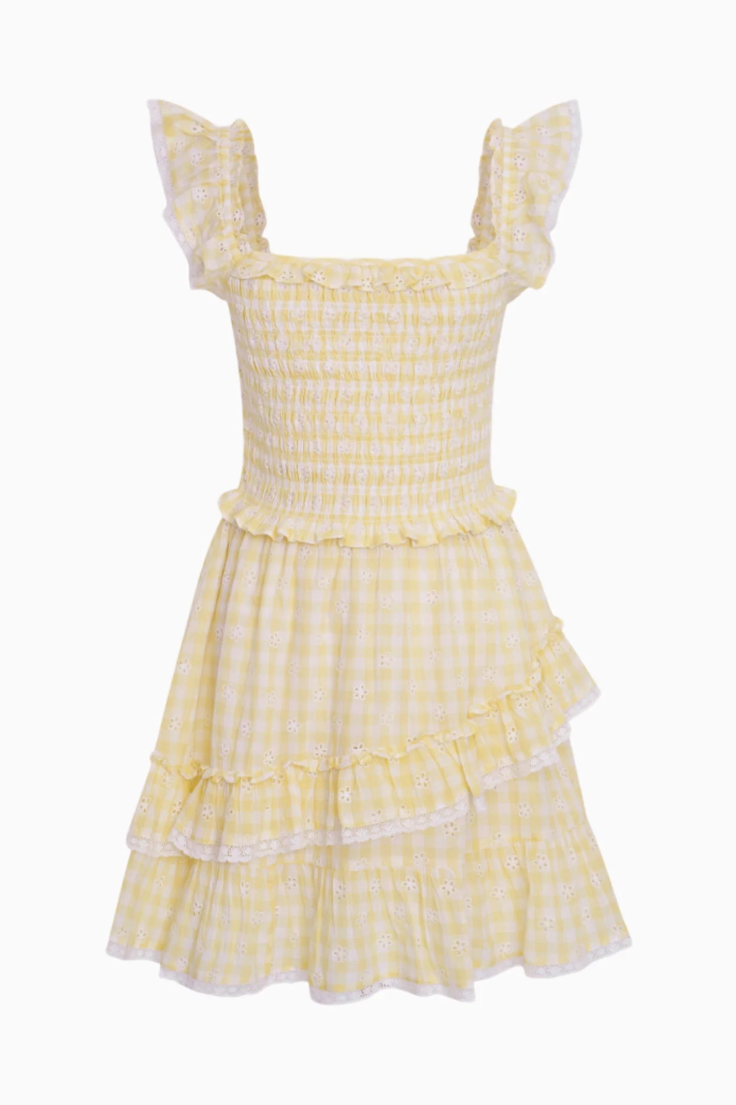 Everyone’s favorite Aline Dress is back. Inspired by summertime in Italy, this charming piece debuts with a gingham dyed yarn on an organic cotton fabric that’s light and airy for the warm weather season. The dress begins with short flutter sleeves that fall to a square neckline above a smocked bodice with a tiny ruffle flounce falling to an airy ruffle-tiered skirt.