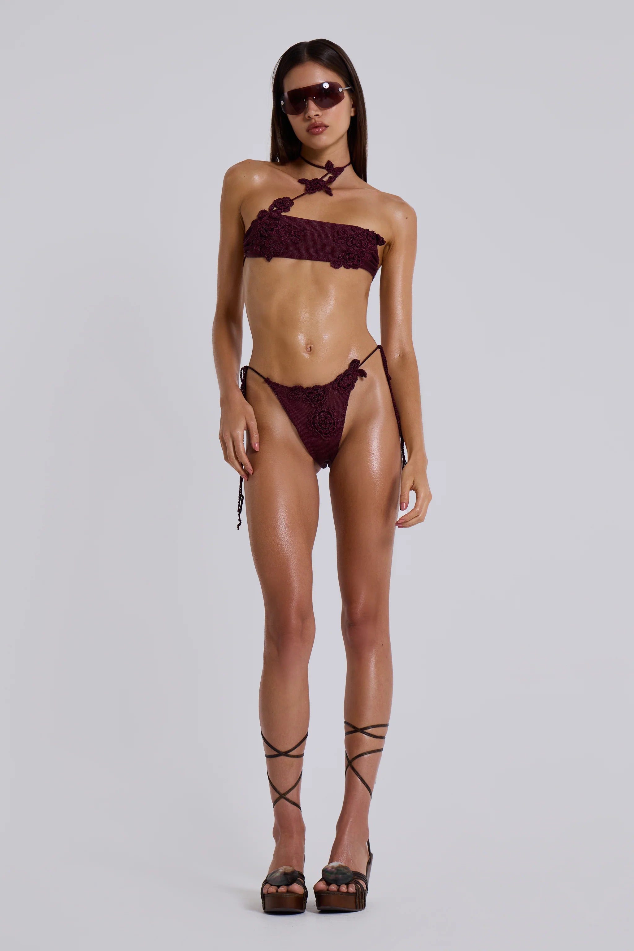 Alira Knit Flower Bikini Bottoms. Crochet tie side bikini bottoms with floral crochet appliqués in burgundy red.