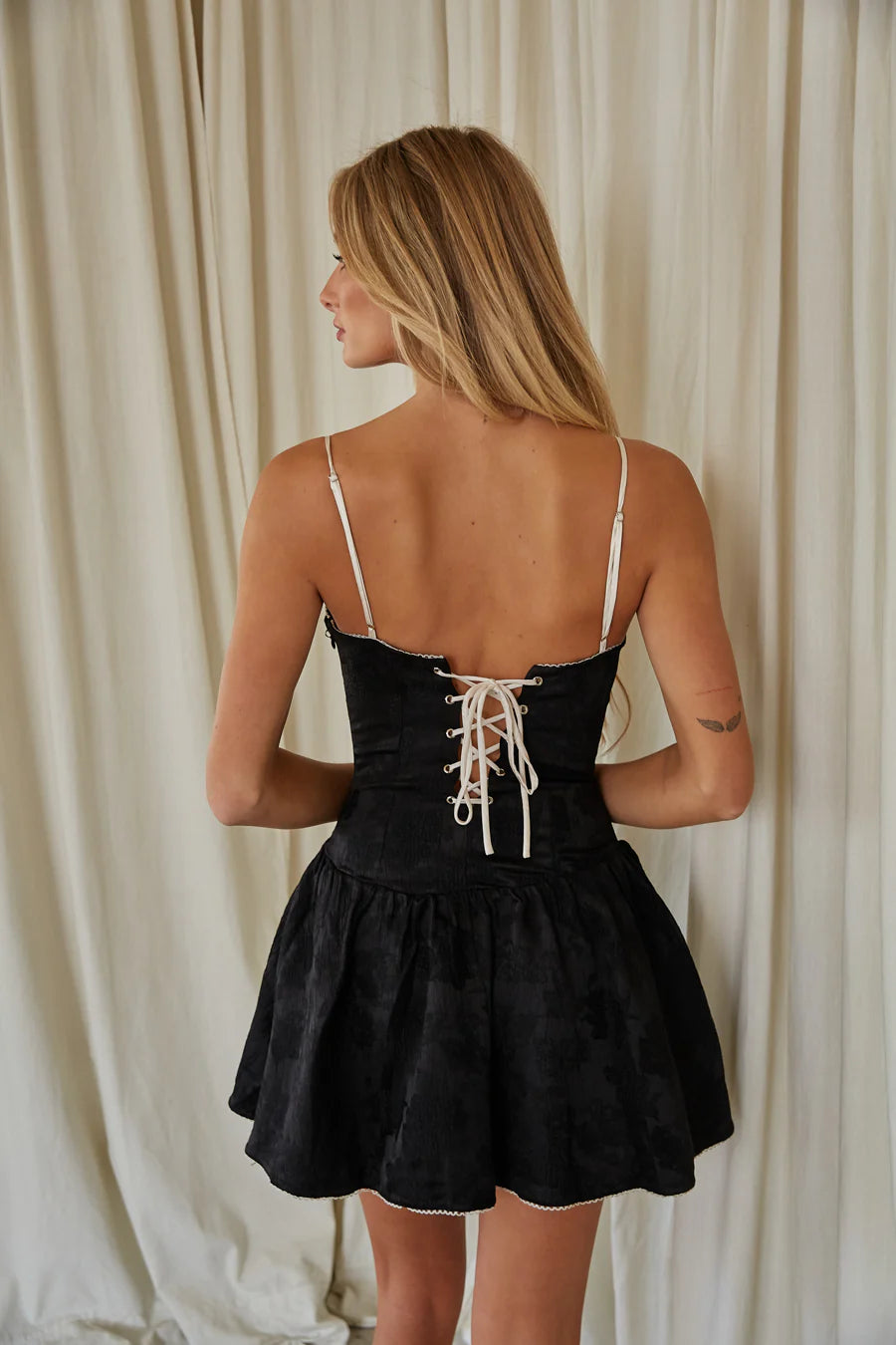 Trendy and timeless, the Alisha Coquette Contrast Fit and Flare Mini Dress is the perfect ! This jacquard dress features a , lace up back, and coquette bow details! Available in Black + White Contrast; style with a chic pair of to complete the look!