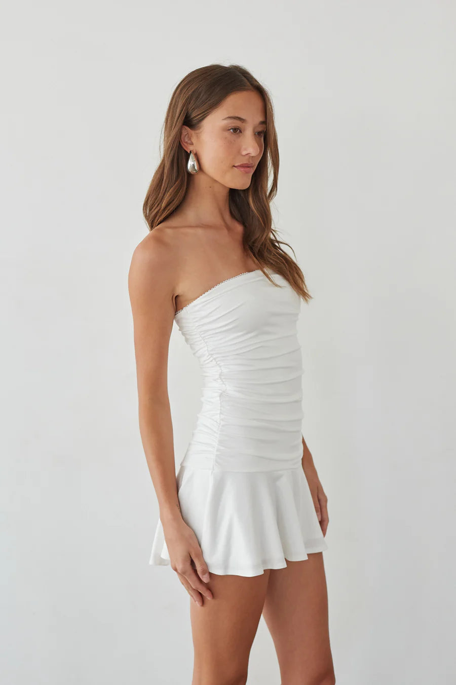Slip into something sexy with the Alora Strapless Ruched Mini Dress. This must-have features a simple strapless neckline, flattering bodycon silhouette, and flirty flare ruffle hem. Available in White, Black, and Red; style with a pair of to complete the look!