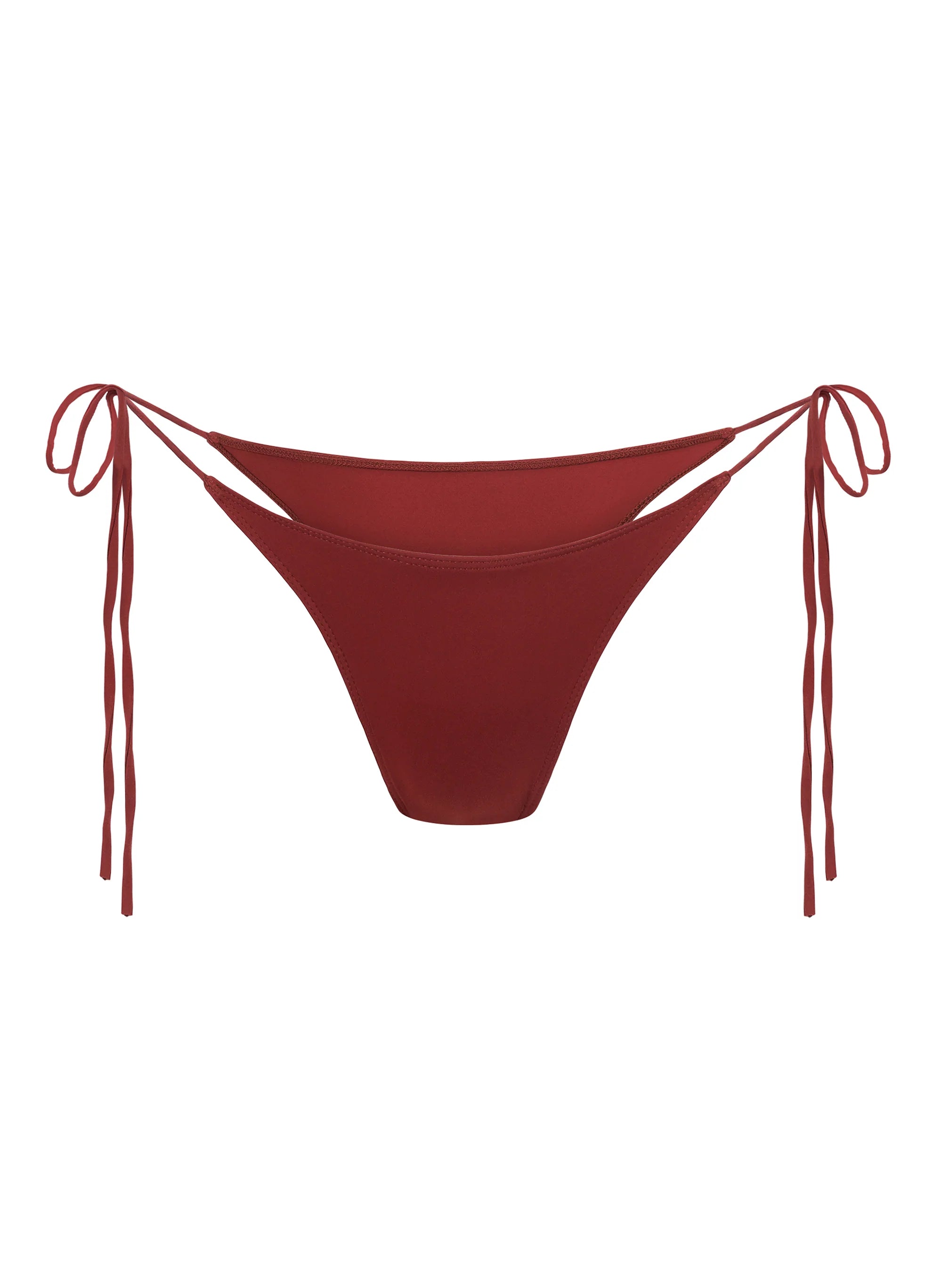 The Amina Bikini Bottom in a syrah hue is crafted from our structured and fade-resistant swim fabric sourced from Italy and made in the USA. with incredible stretch and recovery. This minimal silhouette offers medium coverage with a low rise and string ties for a classic two-piece look. This style runs true to size. Shop Swim.
