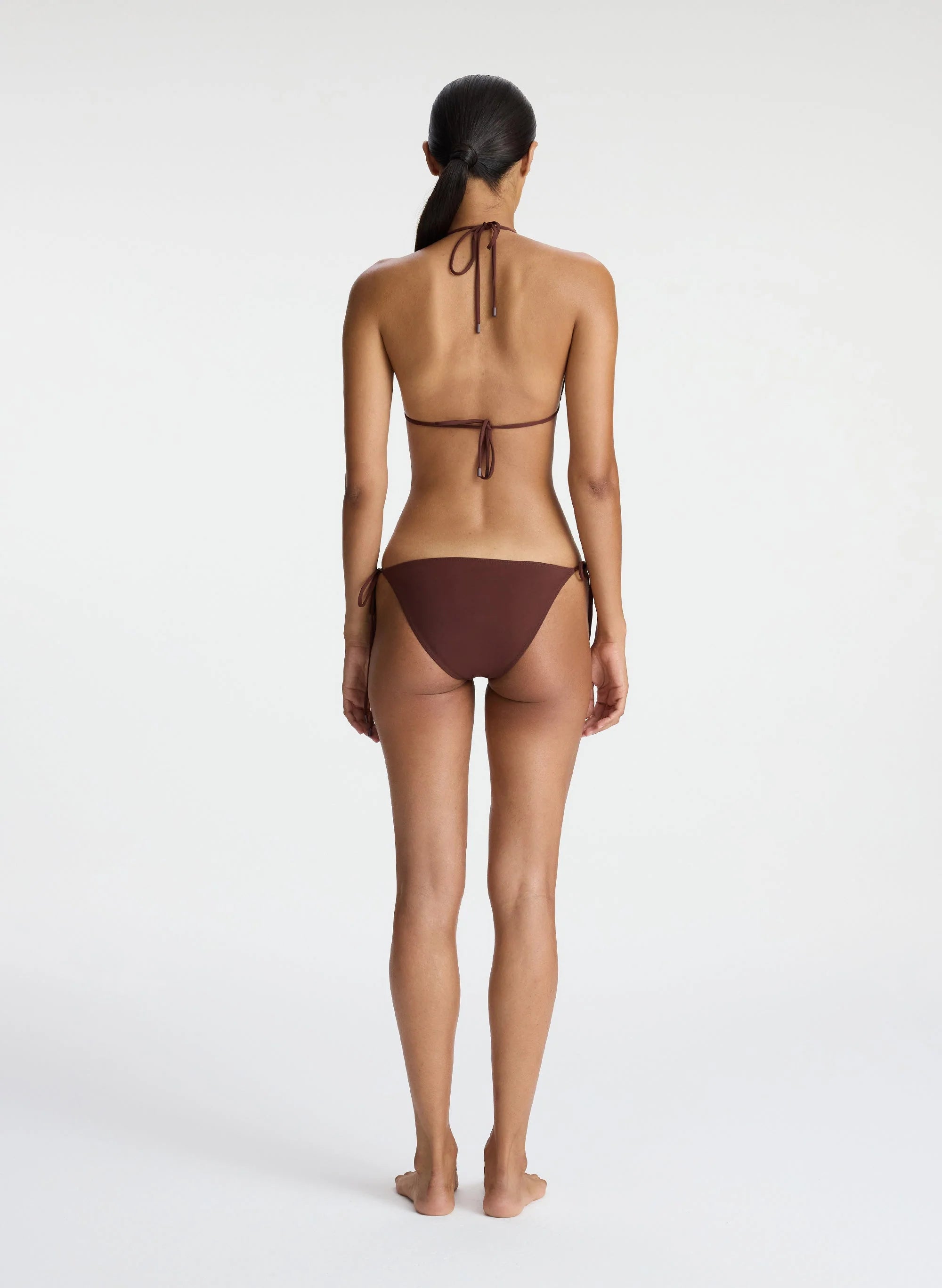 The Amina Bikini Bottom is crafted of sculpting stretch fabric in a chocolate brown hue. This minimal silhouette offers medium coverage with a low rise. This style runs true to size. Shop Swimwear