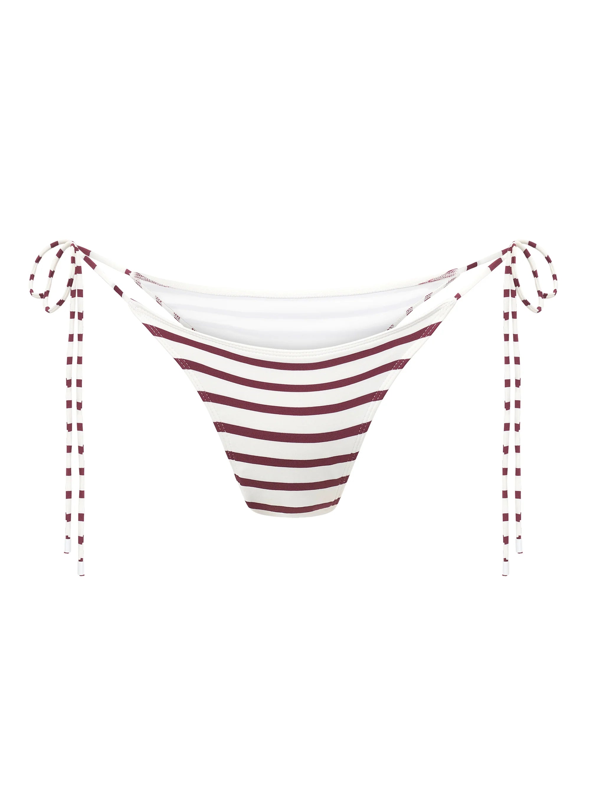 The Amina Bikini Bottom in syrah and off-white stripes is crafted from our structured and fade-resistant swim fabric sourced from Italy and made in the USA. with incredible stretch and recovery. This minimal silhouette offers medium coverage with a low rise and string ties for a classic two-piece look. This style runs true to size. Shop Swim.