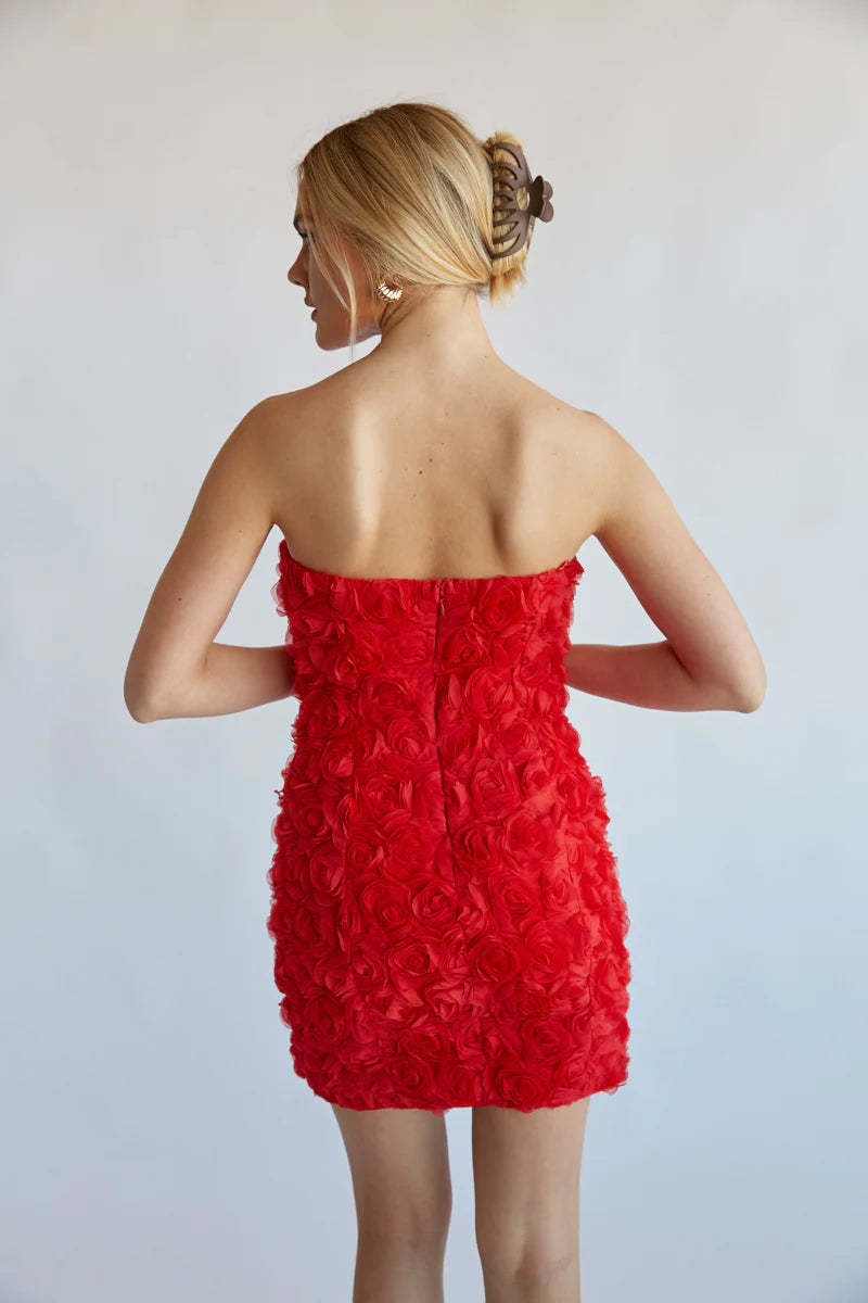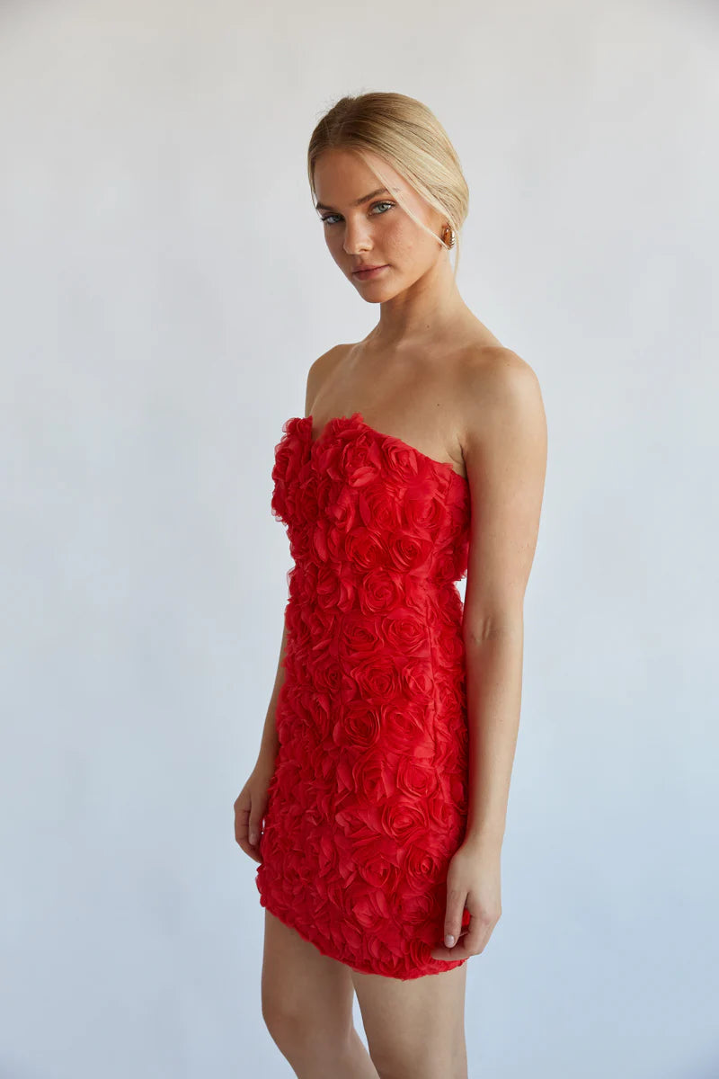 You're sure to stand out in the Angelia Strapless Rose Applique Bodycon Mini Dress! This red hot mini dress features a strapless notched neckline, all over rose applique texture, and a bodycon silhouette. Finish off the look with your favorite !