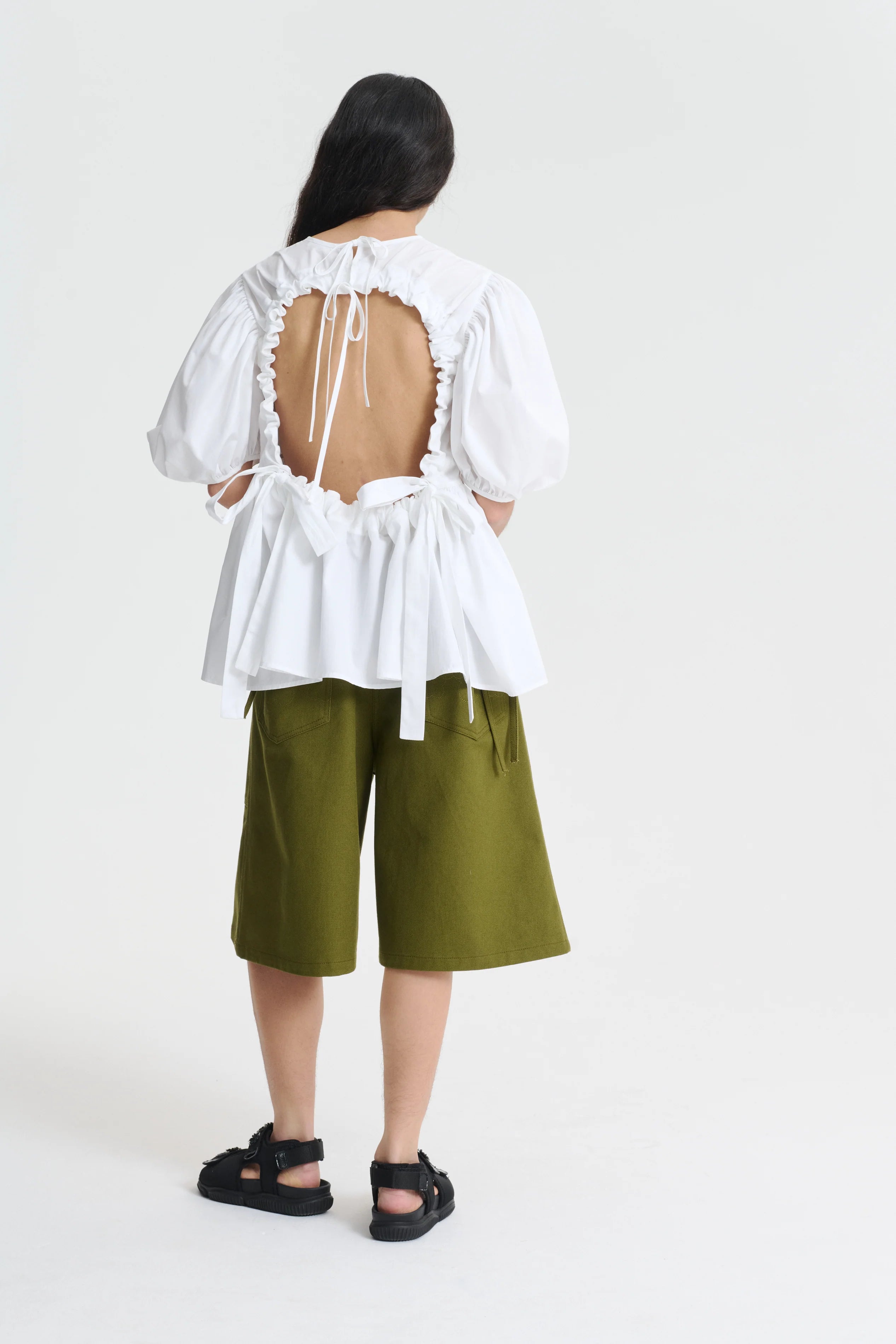 Drawing from Cecilie Bahnsenís repertoire of unexpected details. the Anisha top features signature puff sleeves and baby doll silhouette. while revealing an oversized cut out at the back and dramatic bows pulling the top together. Finished with a keyhole closure and two ties.