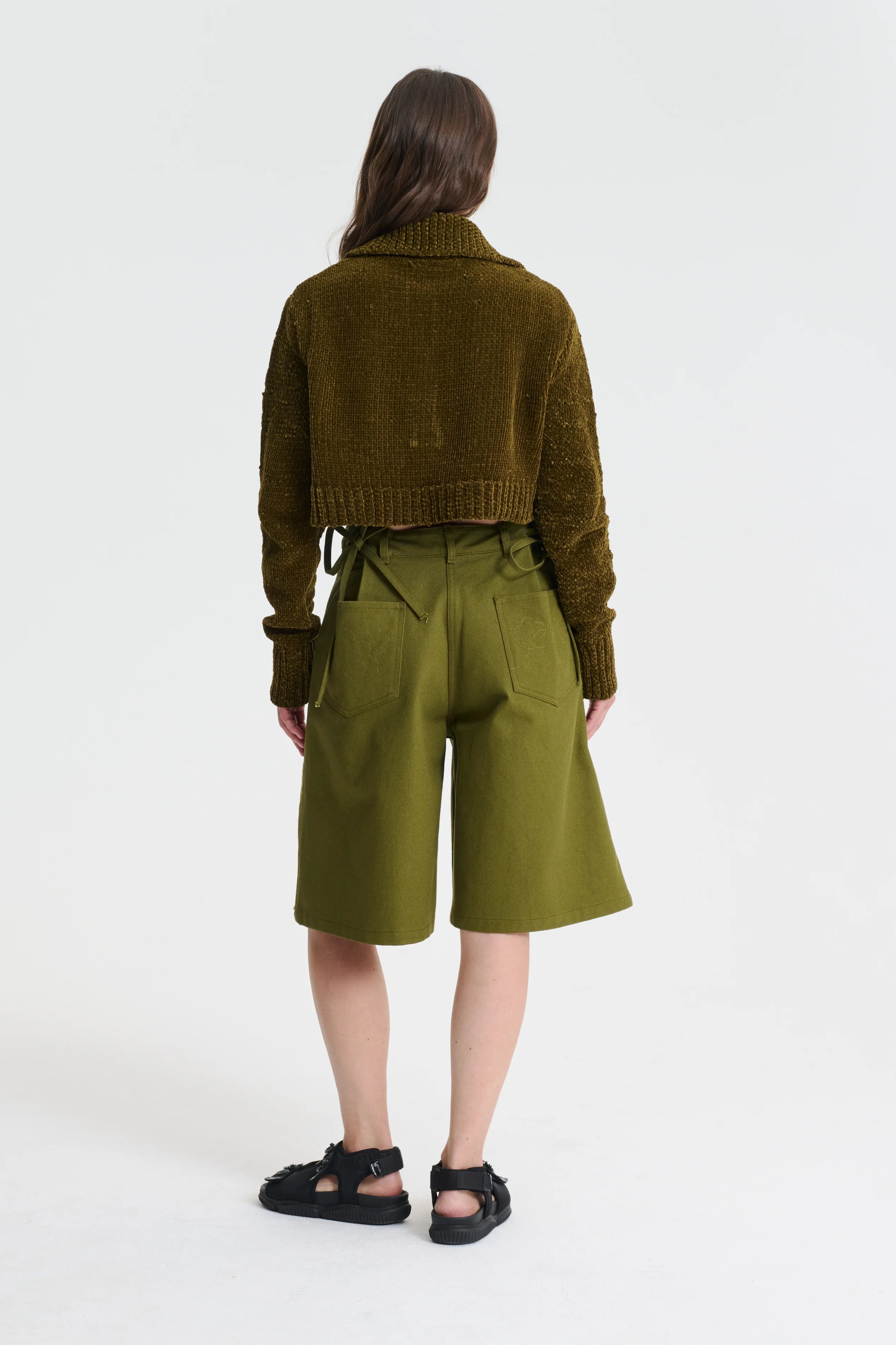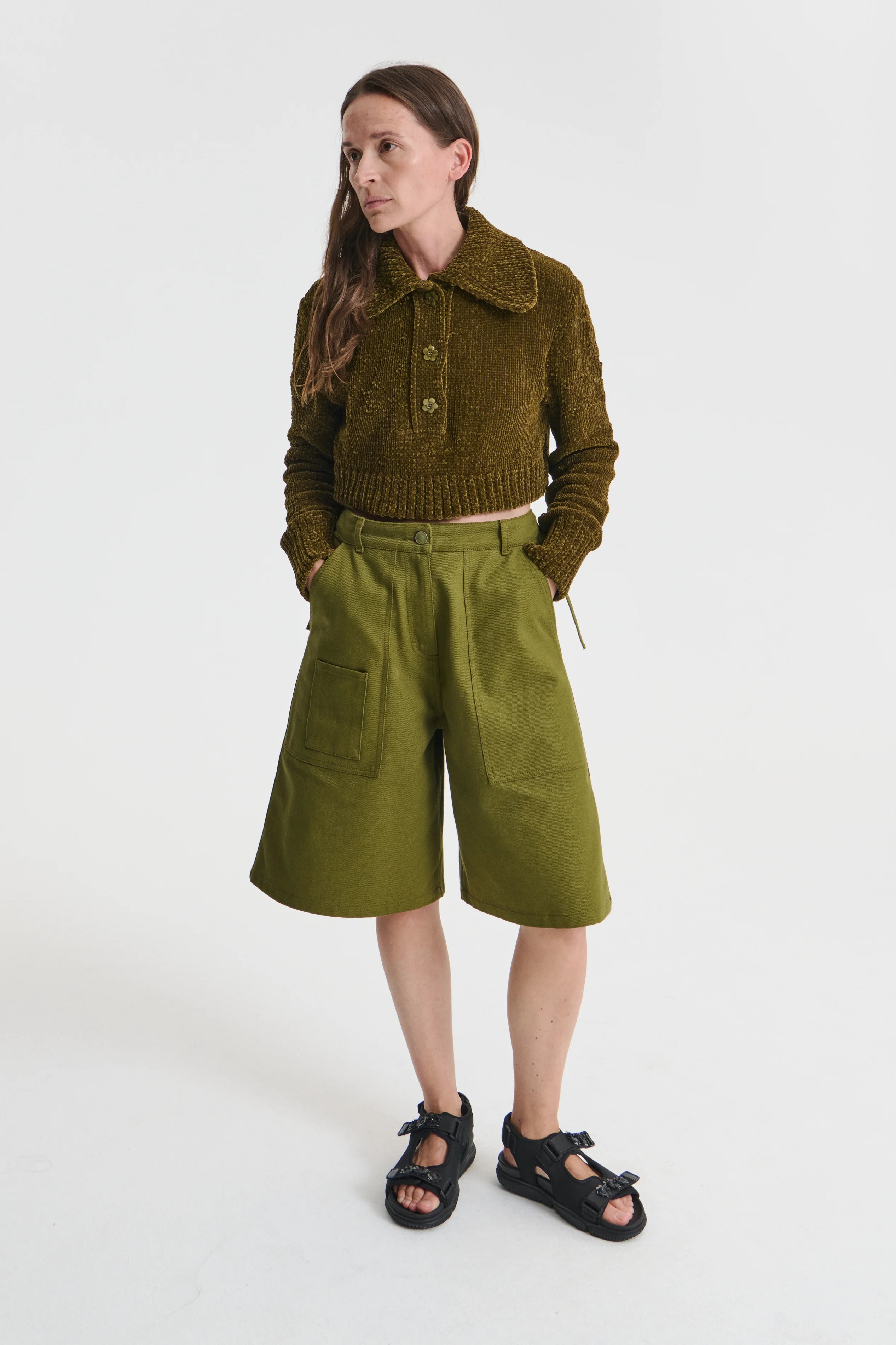 Grounding Cecilie Bahnsenís universe in modern practicality. the Annika shorts. Structural and oversized. the wide leg creates volume. while patchwork pockets add utilitarian notions to the everyday piece.