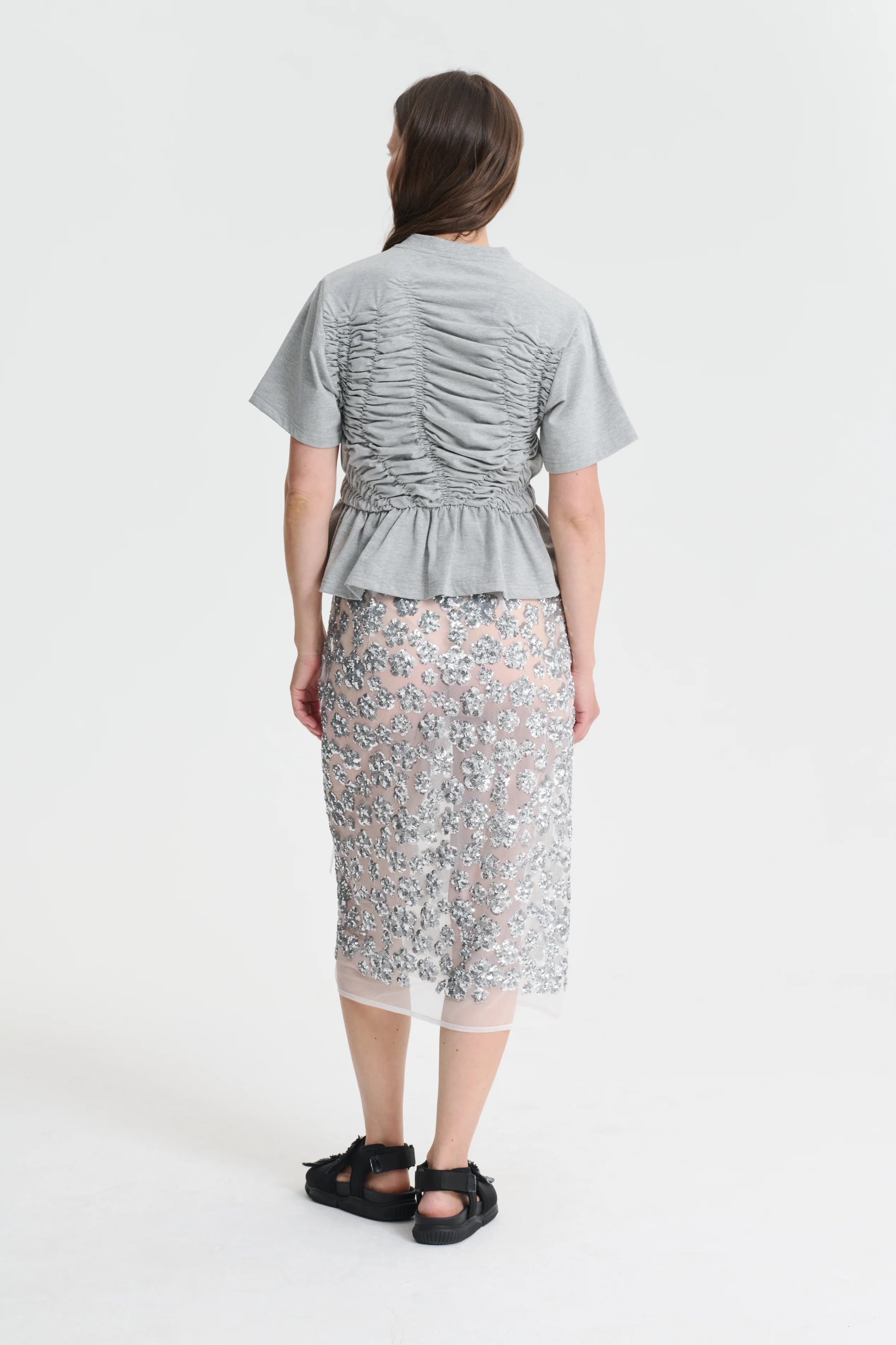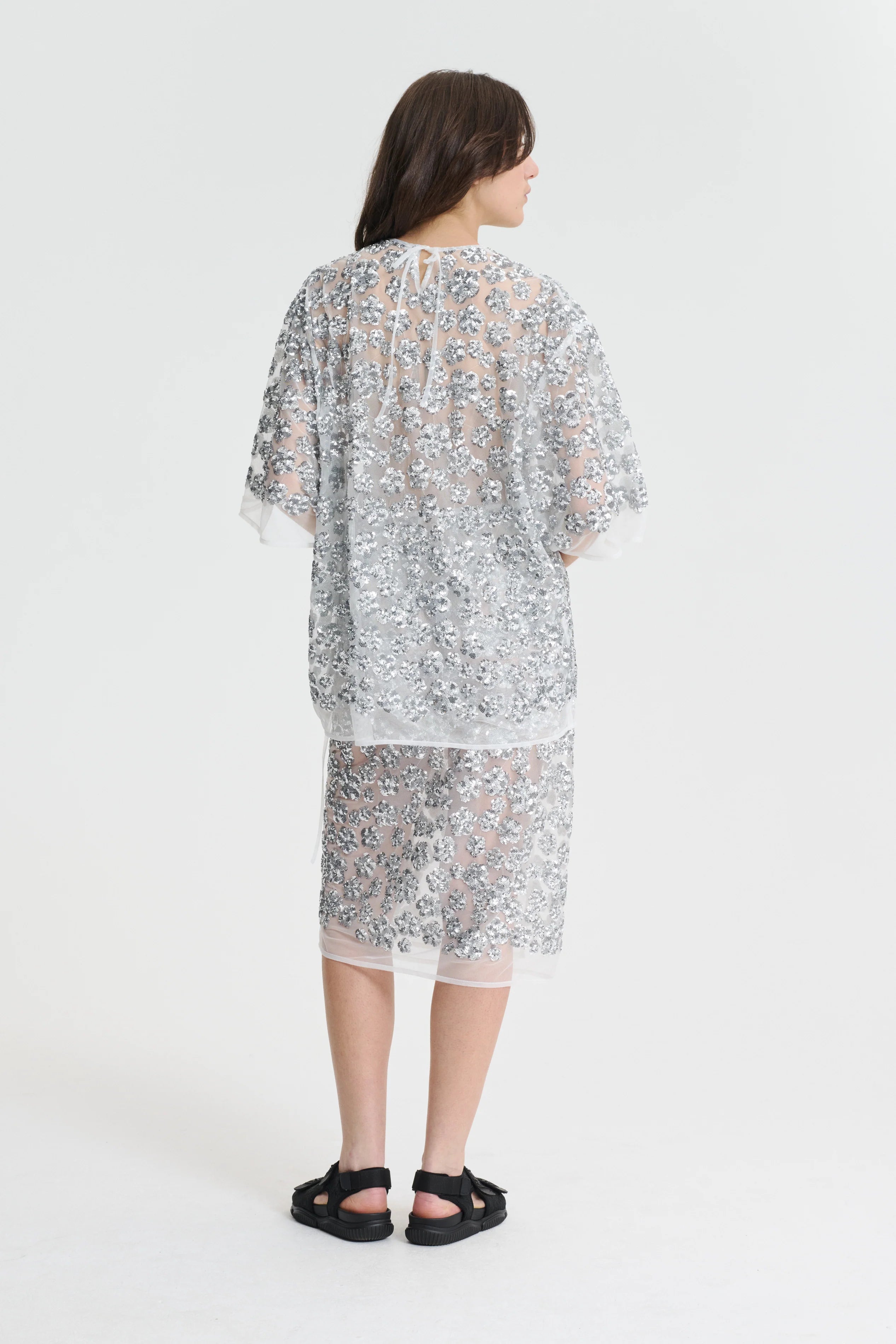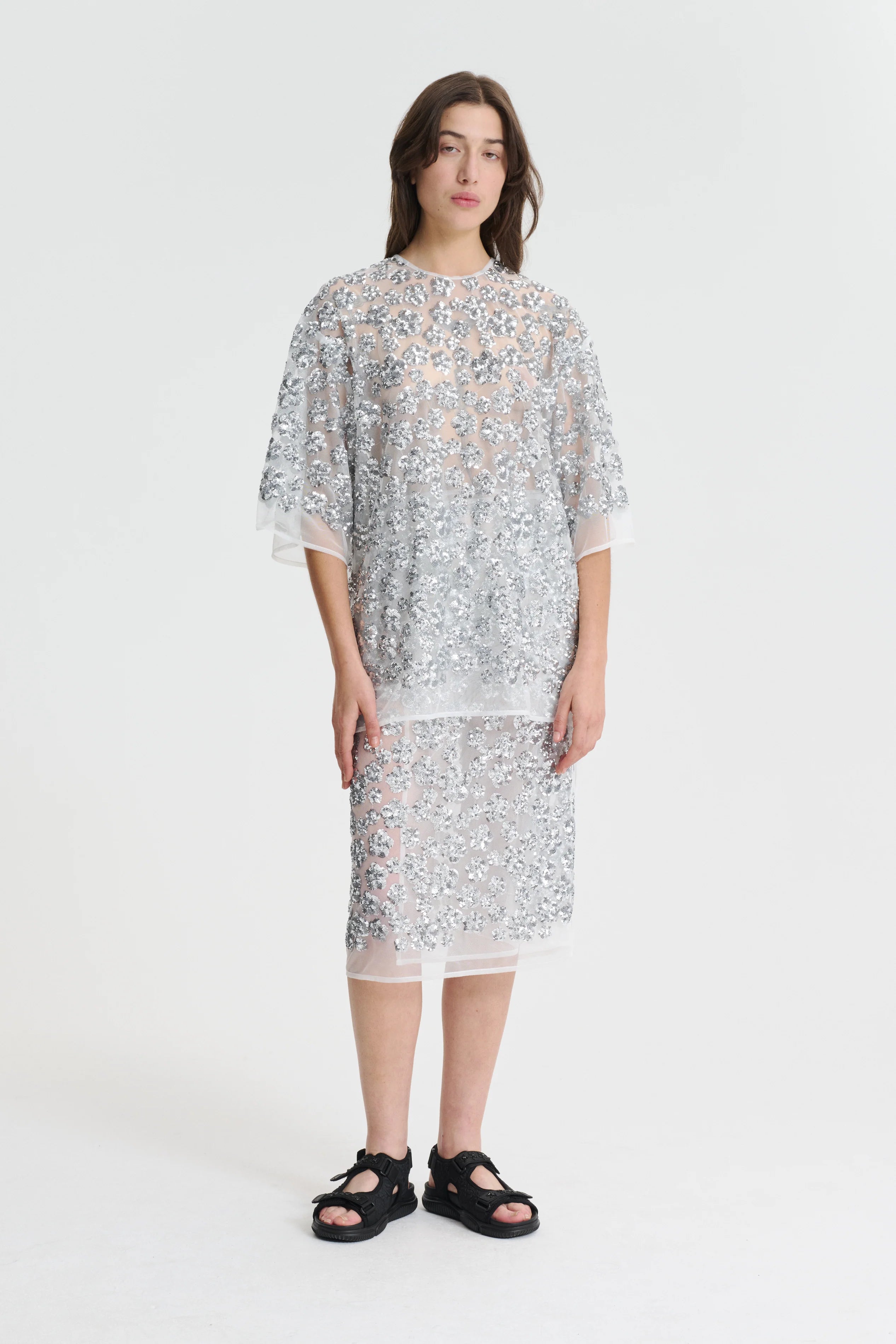 Light and ethereal. the Ariana skirt. A wrap-around silhouette pulled together by a row of ribbons. cut from a silver ume with floral sequins. The bespoke fabric is a dazzling expression of Cecilie Bahnsenís admiration for couture fabrication. combining sparkling details onto the everyday. pencil skirt silhouette.