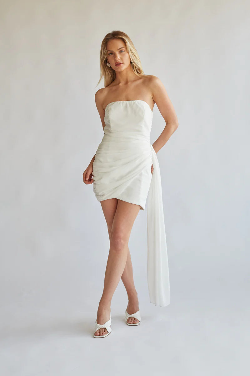 Turn heads in the Ariana Strapless Draped Mini Dress! This beautiful mini dress features a strapless sweetheart neckline, ruched bodycon silhouette, and a cascading drape detail. Pair with a chic for your next special occasion!
