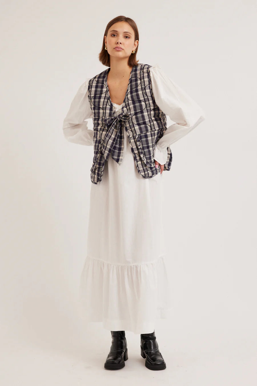 The Arte Gilet is our all over check design cropped gilet featuring a tie front closure. frill pockets and a DM branded embroidery detail.