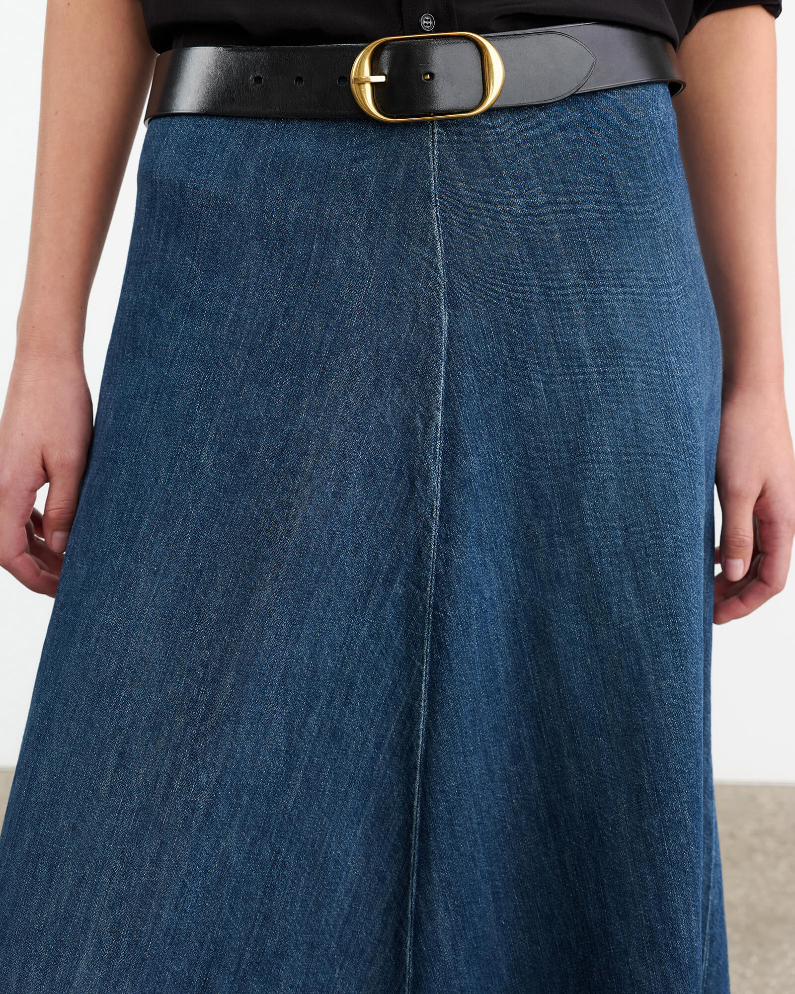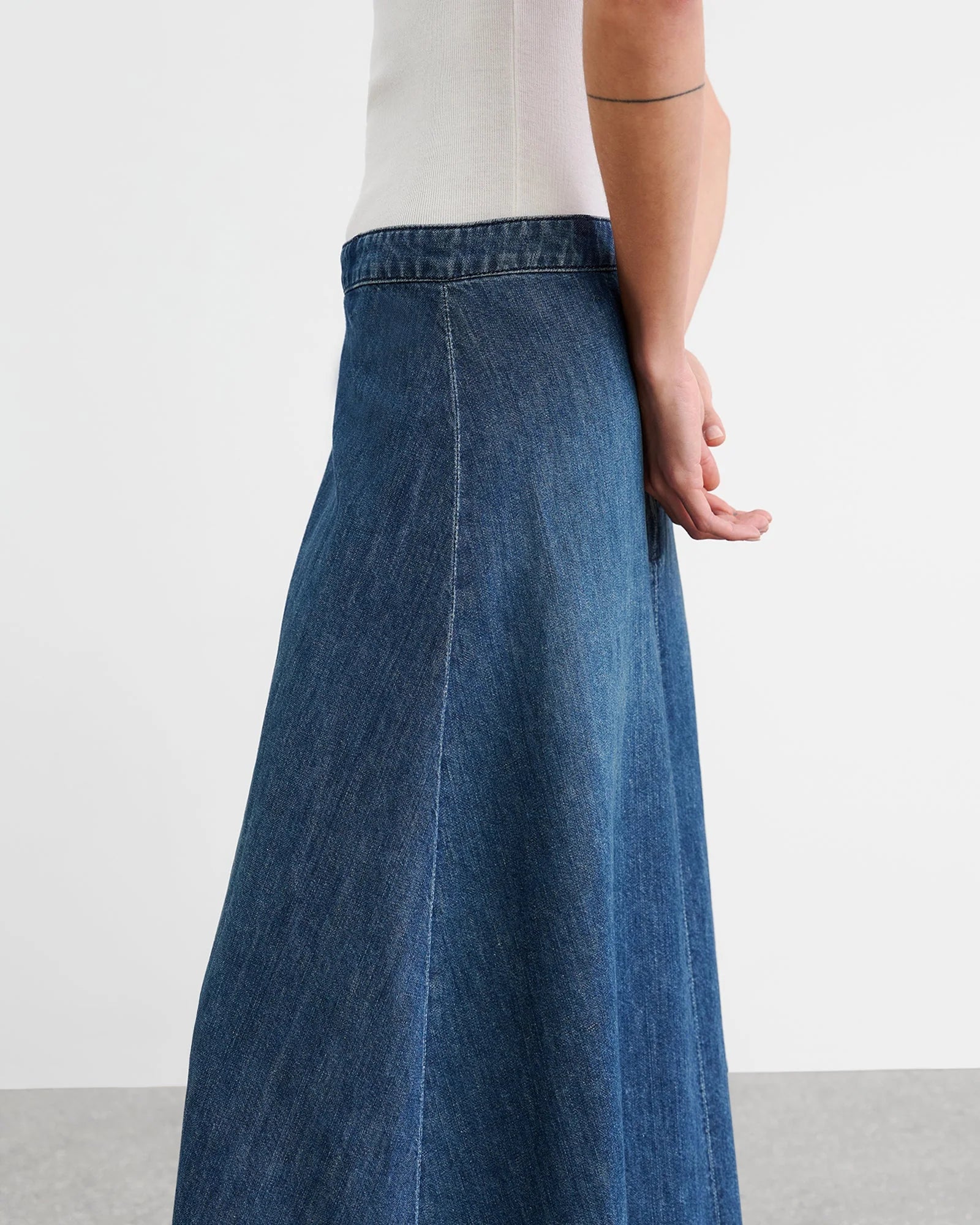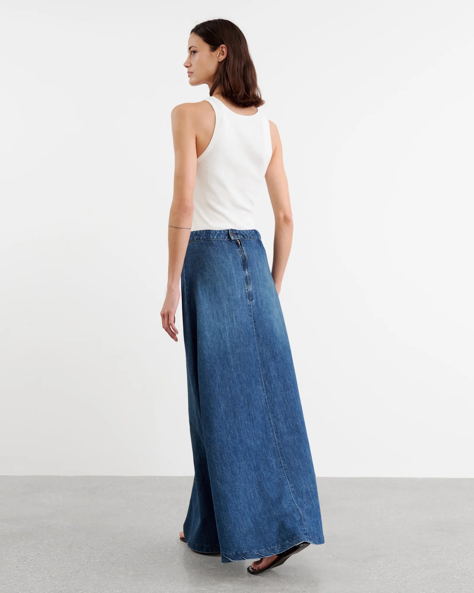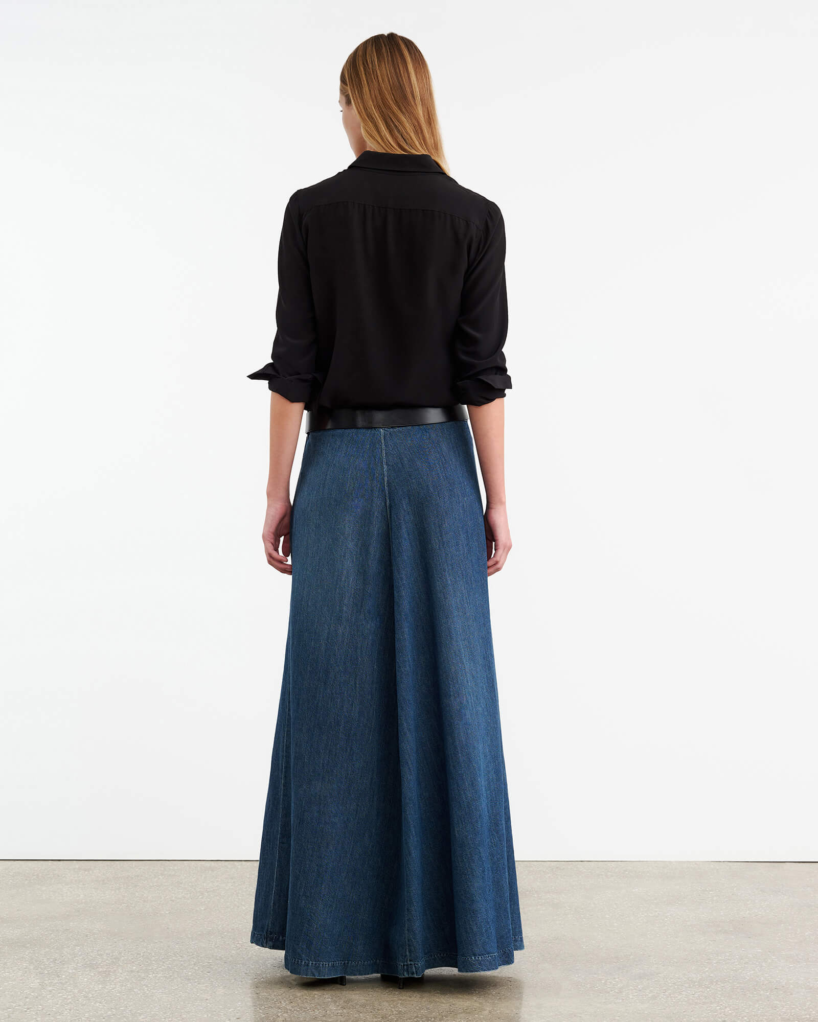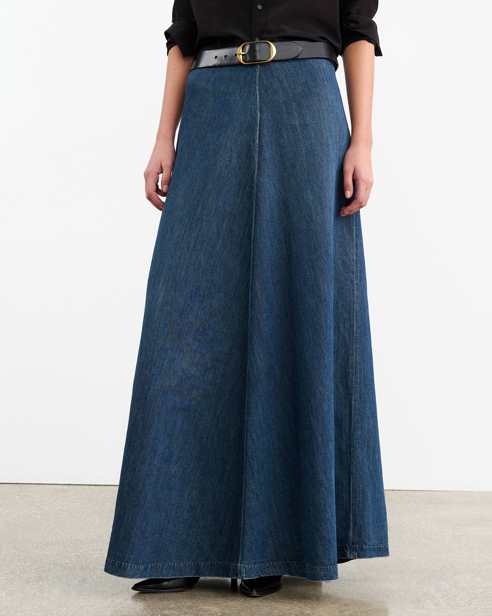 Floor length mid- to low-rise denim skirt. Clean waistband. No belt loops. Front center seam. Classic denim hem finishing. Full through skirt. Back zip. Shank closure.