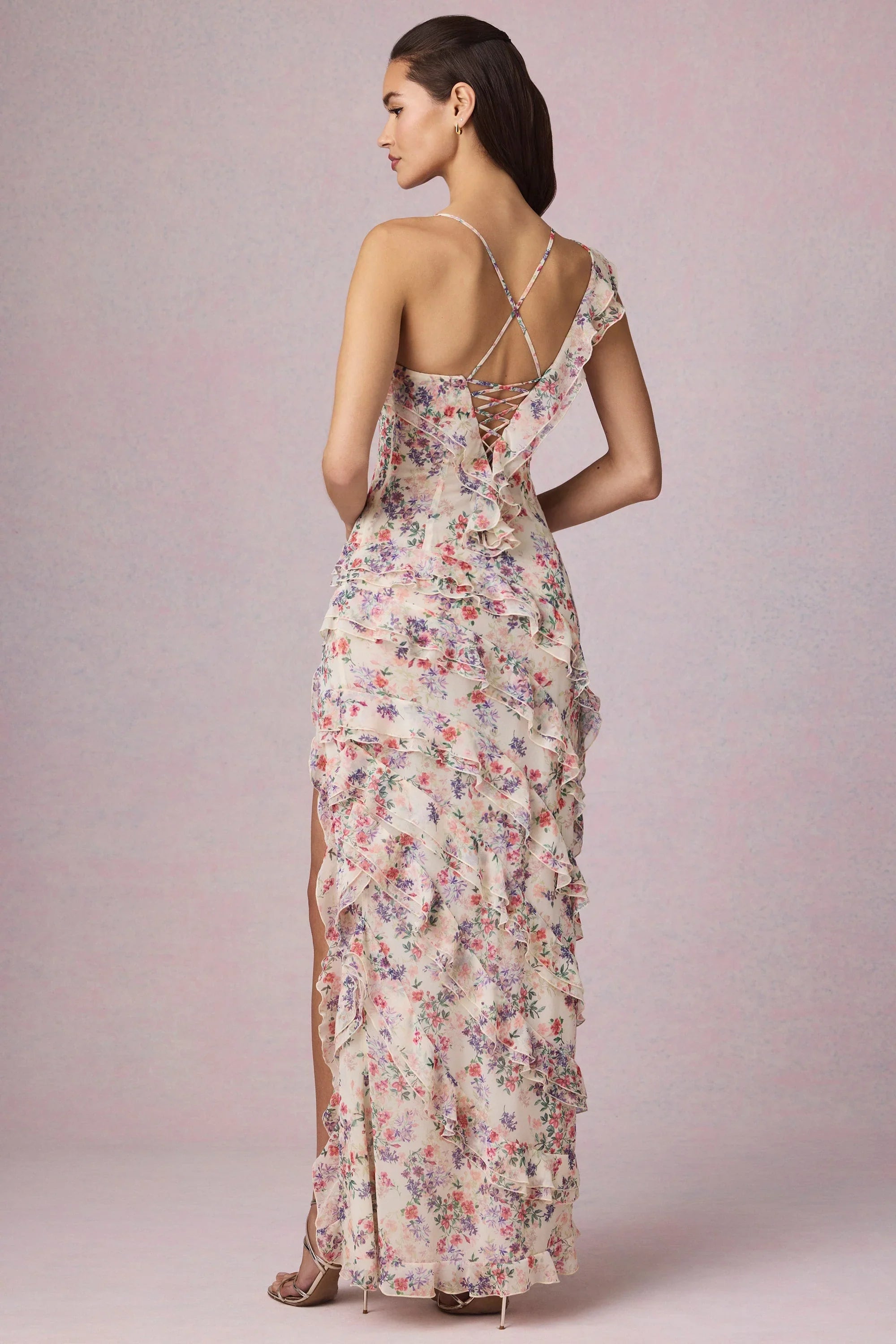 Dressing up? The Hera gown is made for you. Crafted from premium flowing chiffon and designed for a figure-skimming fit, its designed with a striking asymmetric neckline and tiered ruffle skirt with a thigh-high split for dramatic movement. Its complete with criss-cross straps at the back and an adjustable lace-up back, inspired by classic romantic styles, and perfect for your most memorable occasions.