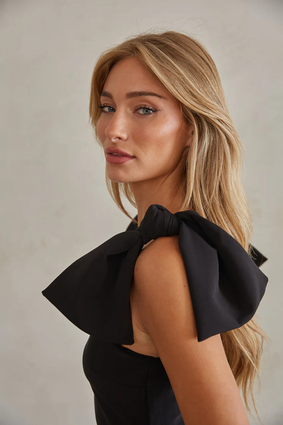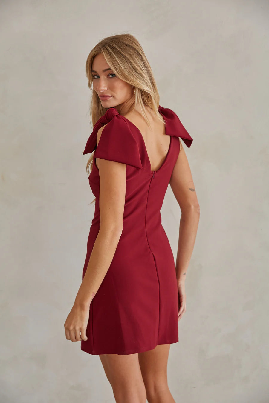 Fall in love with the Audrey Coquette Bow Strap Mini Dress. This features coquette bow tie straps, sexy v neckline, and high quality fabrication. Available in Merlot Red and Classic Black; style this with a pair of to complete the look.