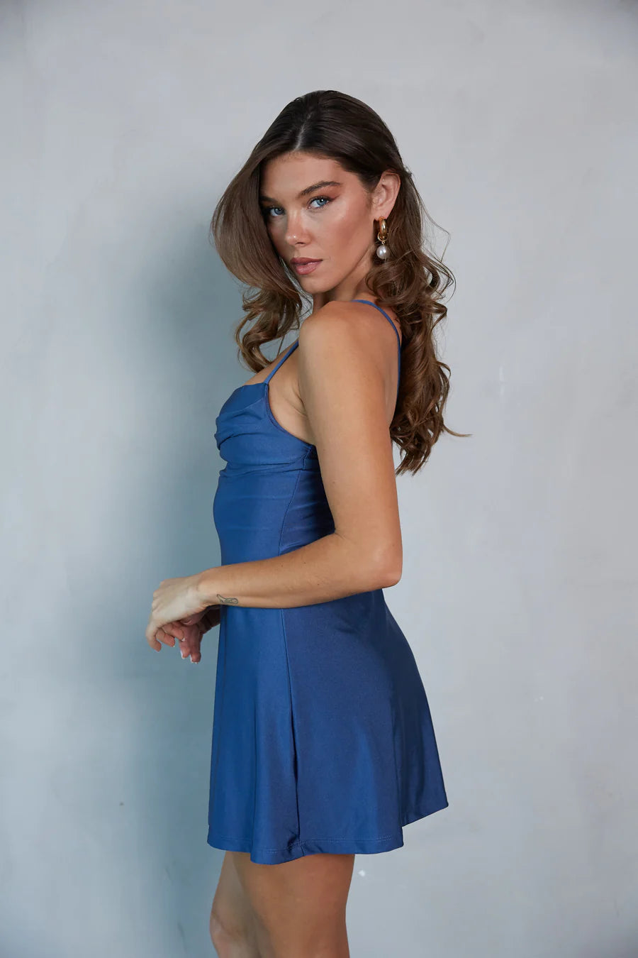 Simply stunning, the Bentley Cowl Neck Fit and Flare Mini Dress is the perfect Winter jewel-tone. This mini dress features a pleated cowl bust, a-line silhouette, and sleek satin fabrication. Available in Sapphire Blue; style with a chic pair of to polish off the look!