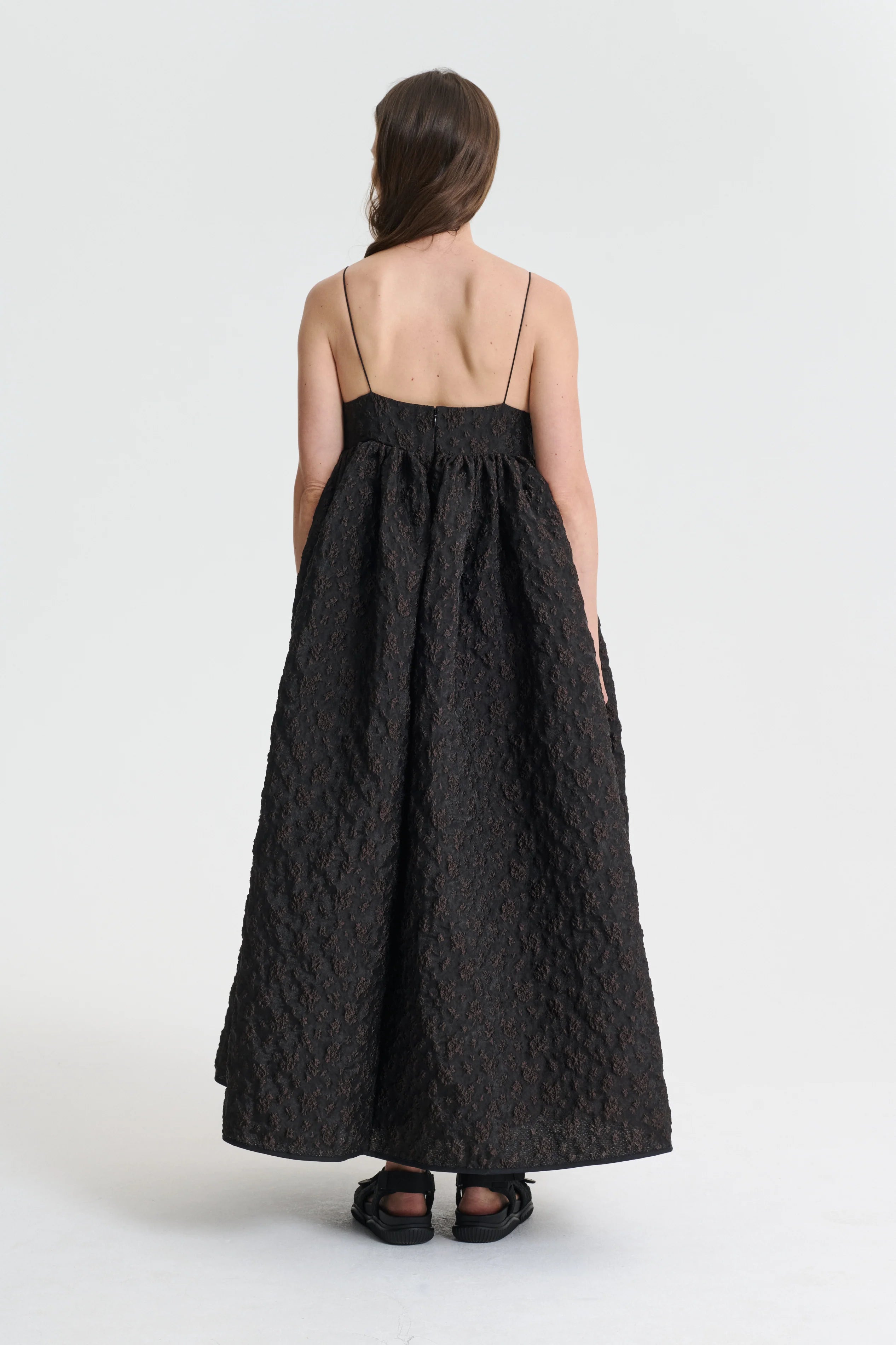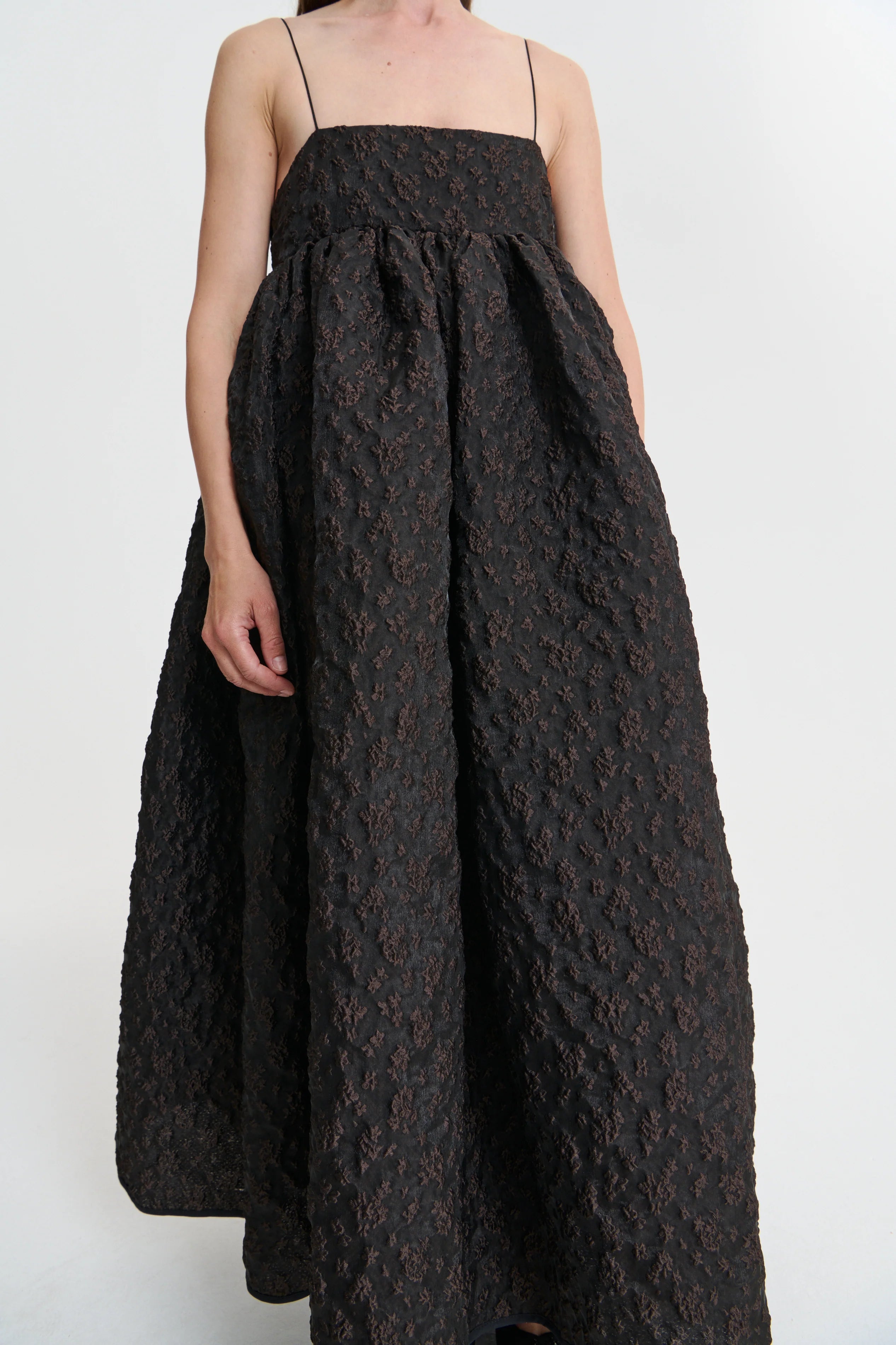 Expressing Cecile Bahnsenís appreciation for couture fabrications. the Beth is crafted from a floral matelassÈ in brown. The minimalist silhouette balances a narrow bandeau with a voluminous skirt that falls to the ankle.