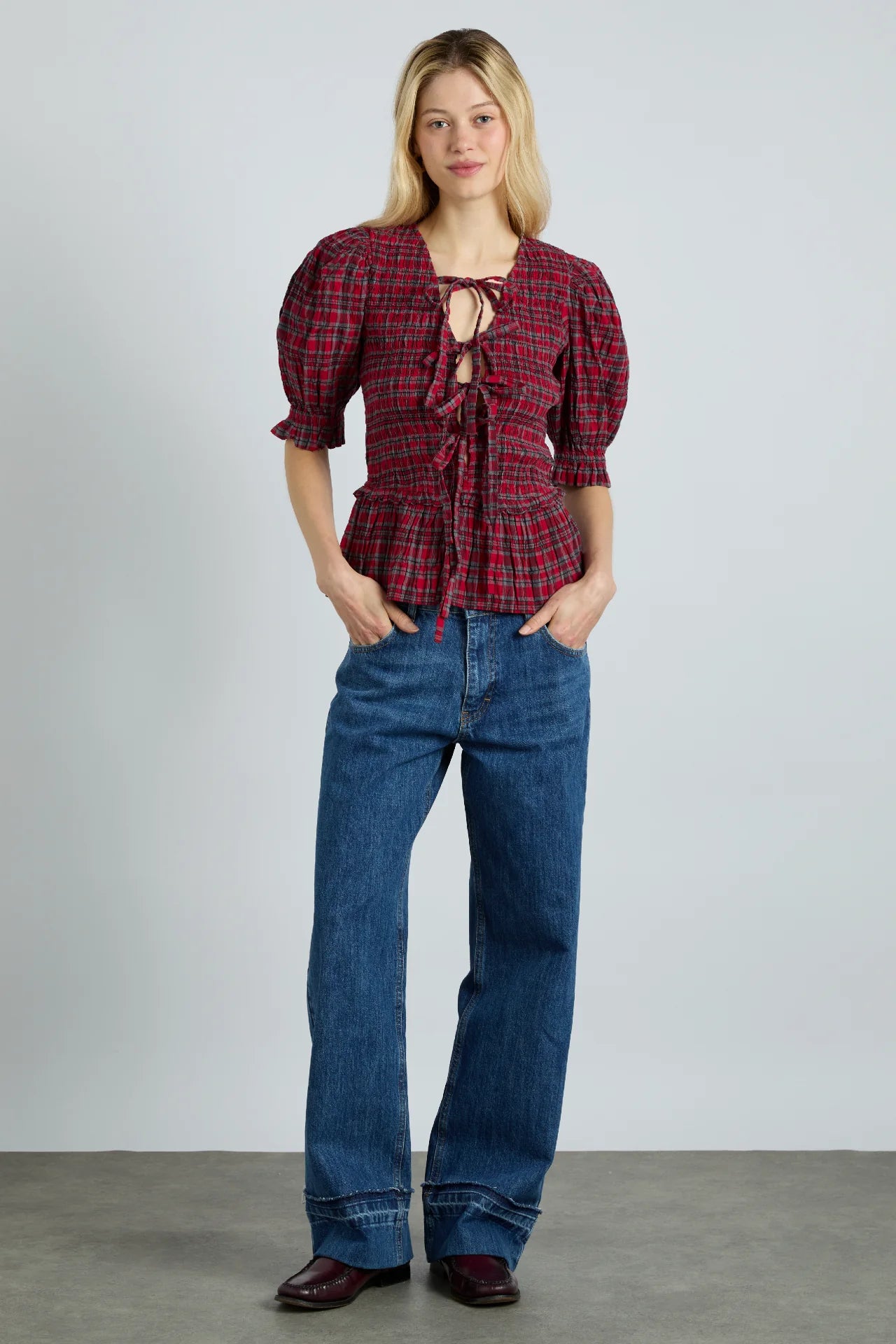 Your favourite dress has been reimagined as a signature blouse. Our fully reversible Bluebelle blouse features all the details we love most; puff sleeves. bow fastenings and a bold checked print.