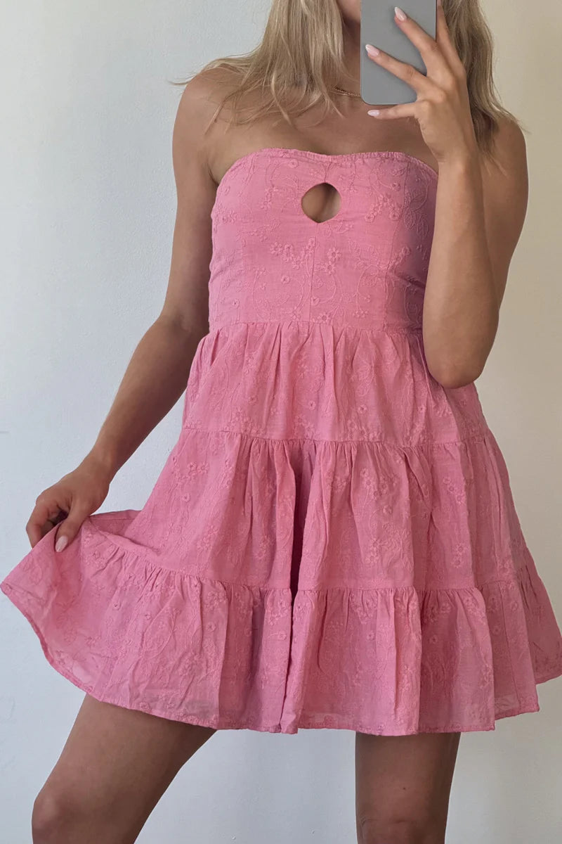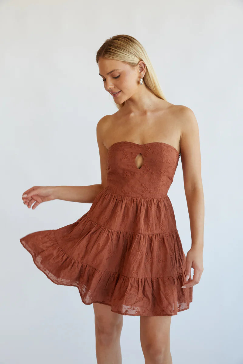 Show off your sweet side in the Blythe Strapless Keyhole Embroidered Babydoll Mini Dress! This mini dress features a beautiful floral embroidery, flowy tiered skirt, and a strapless neckline with a keyhole front detail. Available in baby blue, lilac purple, brown, and black. Finish off the look with your favorite !