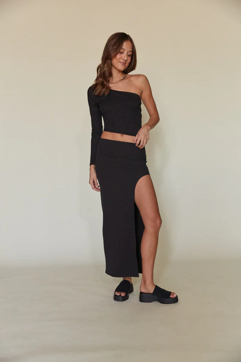 Look sexy and sleek in the Bri Ribbed Midi Skirt! This stylish skirt is made of a ribbed material and features an elastic waistband and a high left side slit. Pair with the B to complete the look!