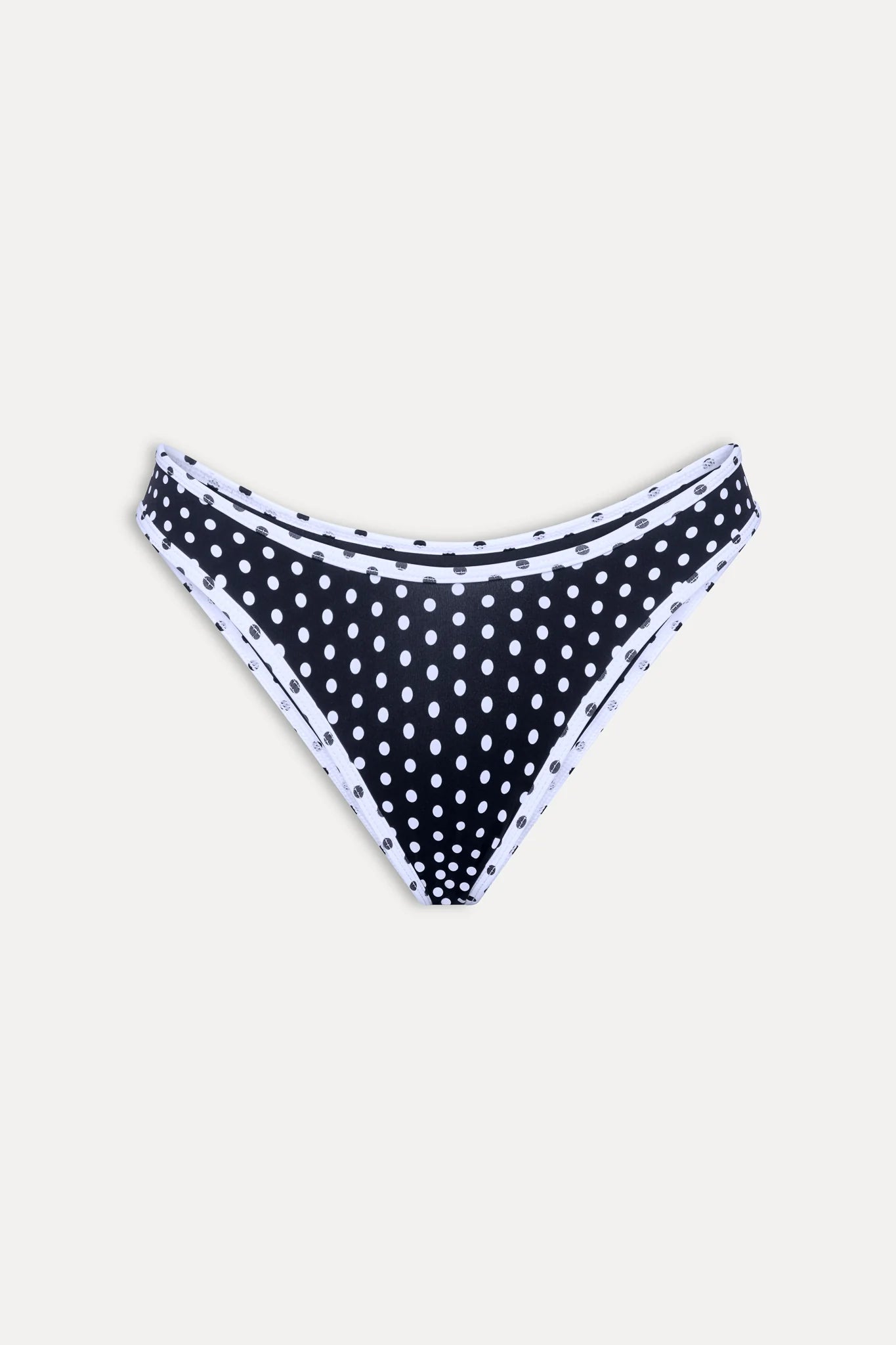Catalina is our signature full coverage style. This bikini bottom is a modest silhouette designed with a classic white and black polka dot pattern.