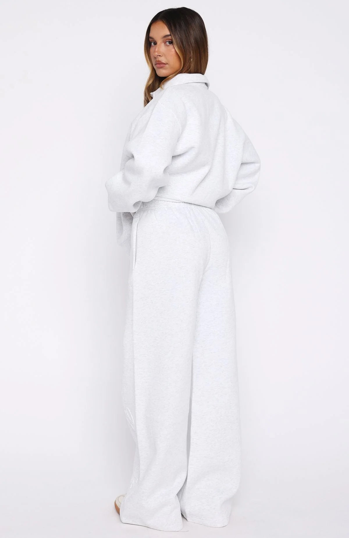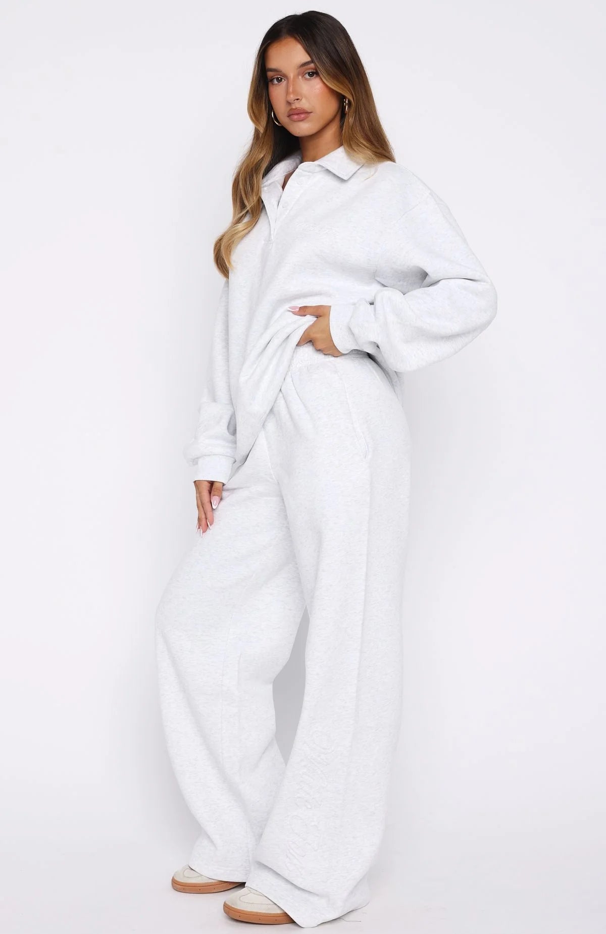 The Stay Lifted Wide Leg Sweatpants in Grey Marle combine comfort and style effortlessly. Crafted from a soft fleece interior, these sweatpants feature an elasticated waistband with an internal drawstring, wide-leg silhouette, oversized fit, and side hip pockets. The embossed White Fox logo along the pant side adds subtle flair. Style with the matching Chill Moves Oversized Henley Sweater Grey Marle.