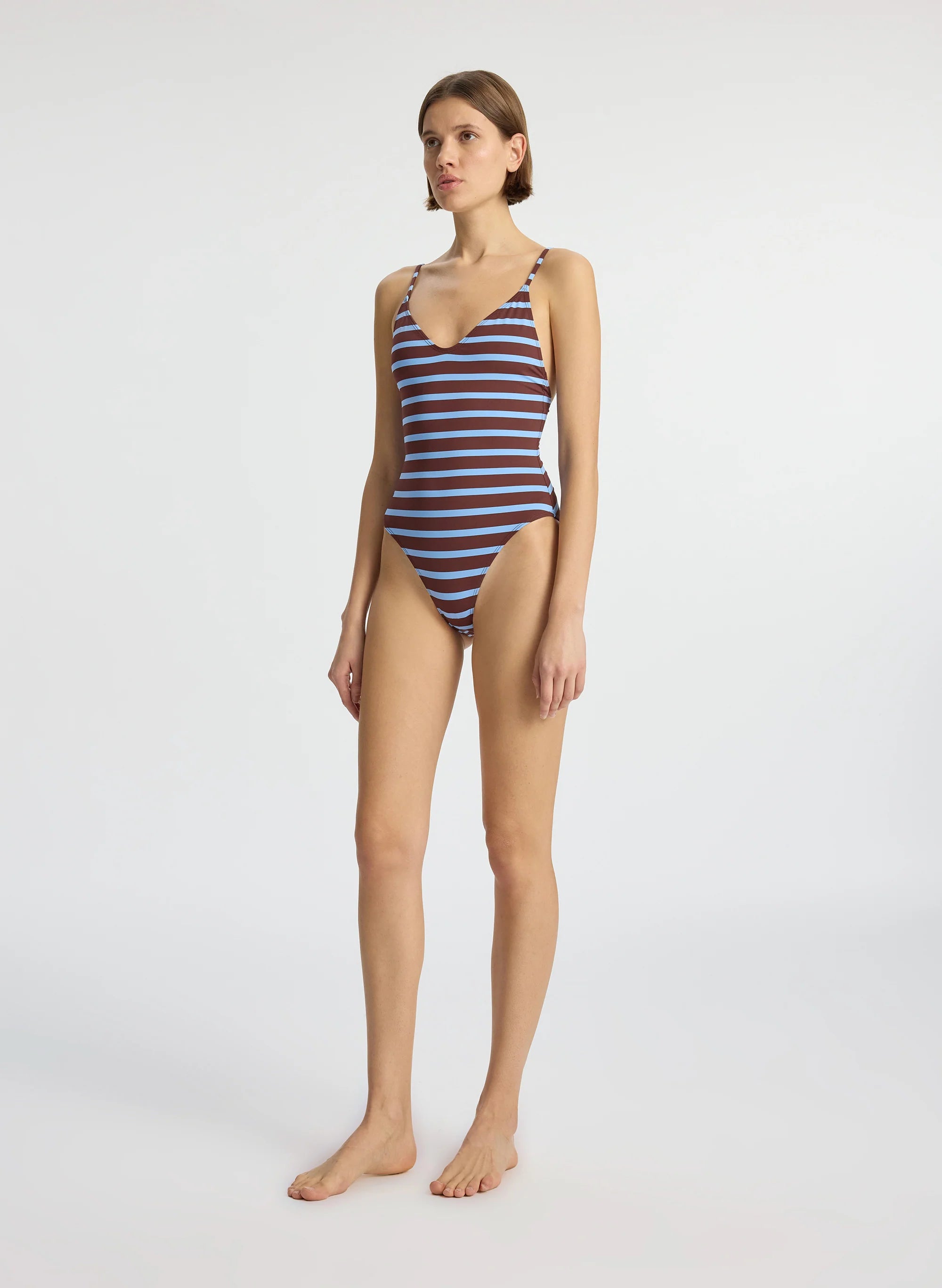 The Cleo Scoop Swimsuit in brown and blue stripes is crafted from our structured and fade-resistant swim fabric sourced from Italy and made in the USA. with incredible stretch and recovery. With a sporty-minimal aesthetic. this one-piece features a plunging scoop neckline. thin adjustable straps. high-cut legs. and medium coverage. This style runs true to size. Shop Swim