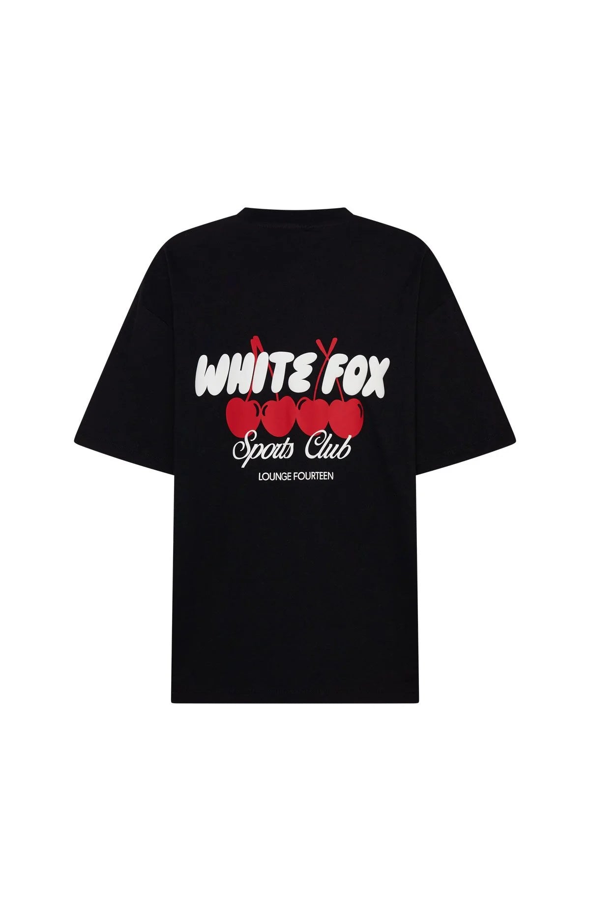 another style within 30 days of receiving your order.Today's uniform! The Club 14 Cassie Oversized Tee Black features a classic crew neckline, relaxed slouched shoulders, breezy short sleeves and oversized silhouette. Finished off with a White Fox puff-print text at the front and back, layered over a cherry graphic for a standout statement. Pair with the matching Club 14 Cassie Wide Leg Sweatpants or Club 14 Cassie Lounge Shorts.