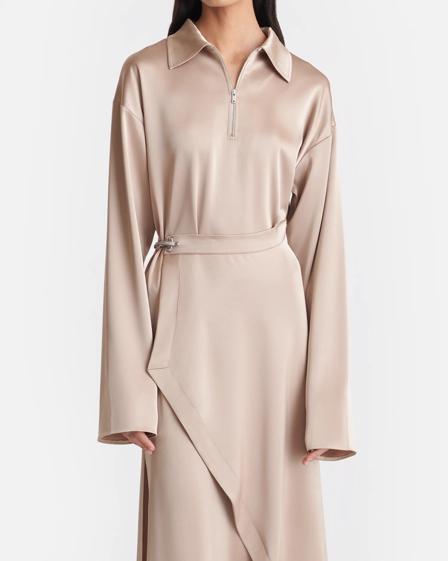 The Colter slip satin midi dress is draped in a way that feels equally fresh and elegant. It also has a zip-fastening neckline and buckle at the waist – biker-inspired details that emphasis the modern feel.