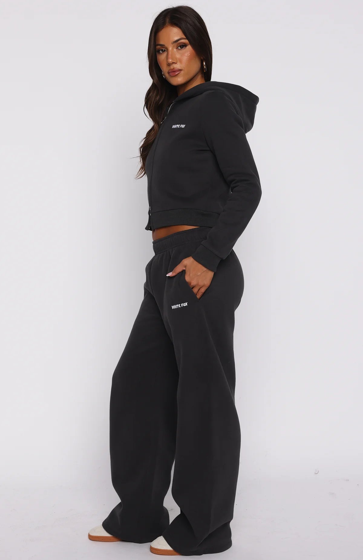 Your new go-to for laid-back luxe. The Comfy And Cute Wide Leg Sweatpants Charcoal is designed with a thick elasticated waistband featuring an internal drawstring tie, side pockets, and a wide-leg silhouette. The White Fox embroidered text at the side adds a signature touch, while the unlined fleece interior ensures a cozy feel. Style with the matching Comfy And Cute Slim Zip Front Hoodie Charcoal.
