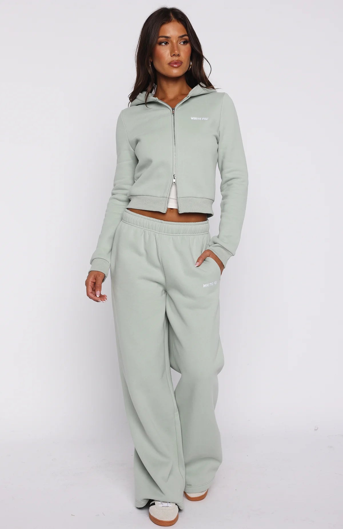 Your new go-to for laid-back luxe. The Comfy And Cute Wide Leg Sweatpants Seafoam is designed with a thick elasticated waistband featuring an internal drawstring tie, side pockets, and a wide-leg silhouette. The White Fox embroidered text at the side adds a signature touch, while the unlined fleece interior ensures a cozy feel. Style with the matching Comfy And Cute Slim Zip Front Hoodie Seafoam.