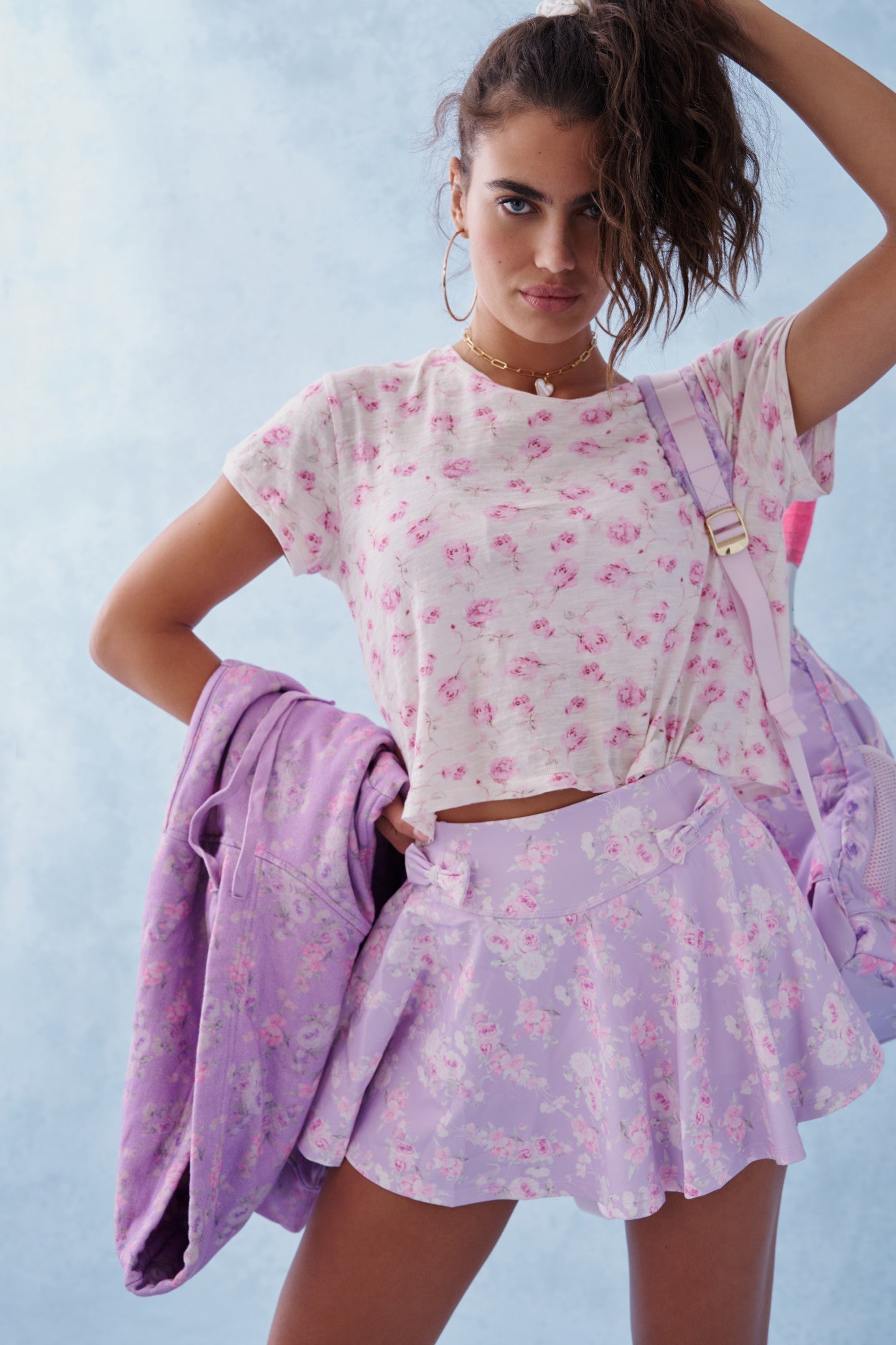 For the girls who like serving looks on and off the court, the Corene Skort returns for the season. Style meets functionality with this flirty, sporty skirt featuring our signature floral prints, built-in shorts, bow details on the hips, princess seams on the yoke, shearing at the yoke seam, pockets, and an airy, ruffle skirt. Designed with a lightweight, breathable fabric this active skirt is perfect for low and high impact workouts.