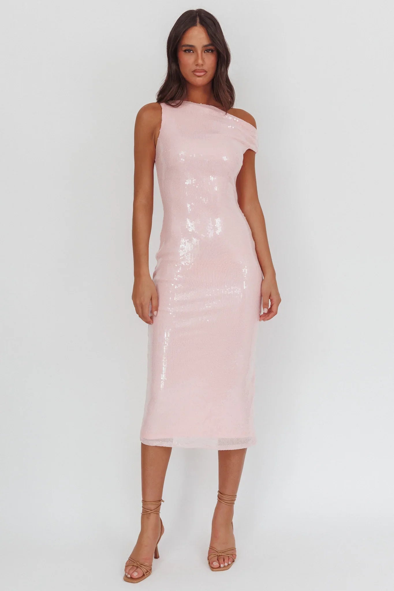 You will steal the limelight in our stunning Country Club midi dress. Featuring an asymmetric neckline and sequins throughout, it's perfect for homecoming or a bachelorette. Team it with strappy, silver heels and a purse for a head-turning look.