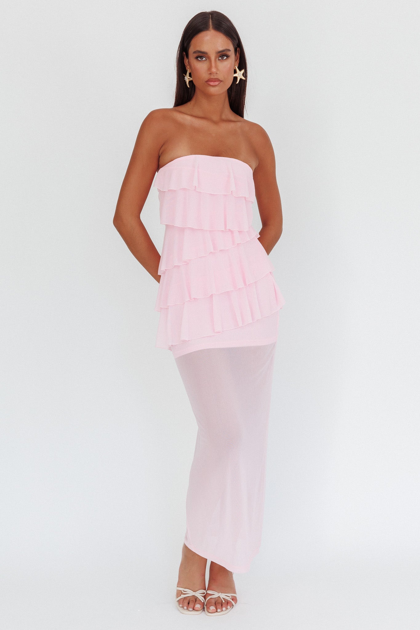 You'll be flooded with compliments in our stunning Crewe maxi dress. It features a mesh overlay and tiered ruffle trim throughout. It's perfect for an anniversary dinner or a glam night out with your girls. Team it with strappy, tie-up heels and a clutch to complete the look.