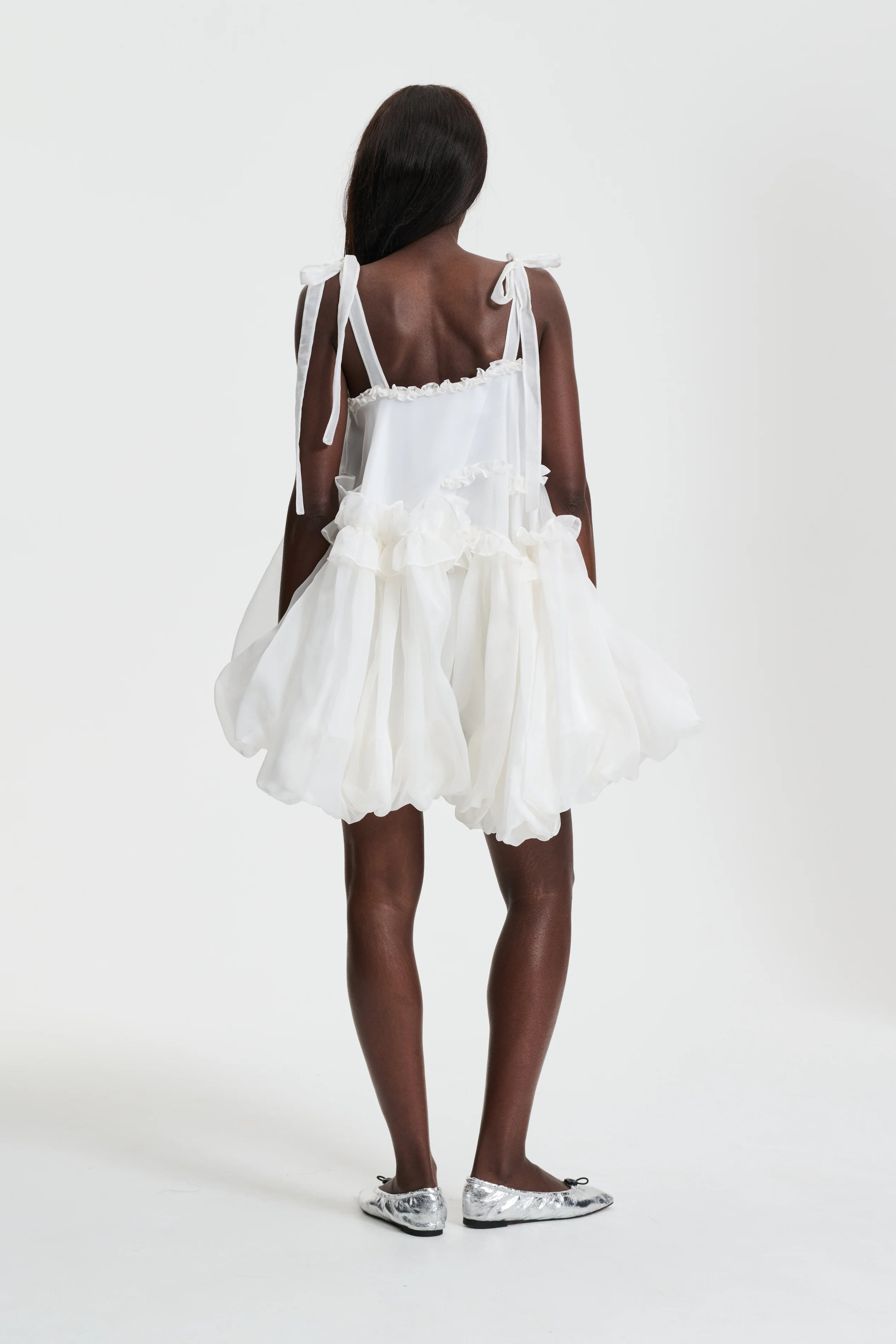 A delightful blend of volume and grace create a contemporary charm with the Cristina Dress. Cut from satin organza. this captivating piece boasts sculptural proportions accentuated by subtle ruffle detailing. creating a dynamic and playful silhouette. Adorned with a charming bow closure gracefully draping along the shoulder. for a touch of elegance against its whimsical design. The widened construction along the waist evokes a sense of airy lightness. ensuring both comfort and effortless style.