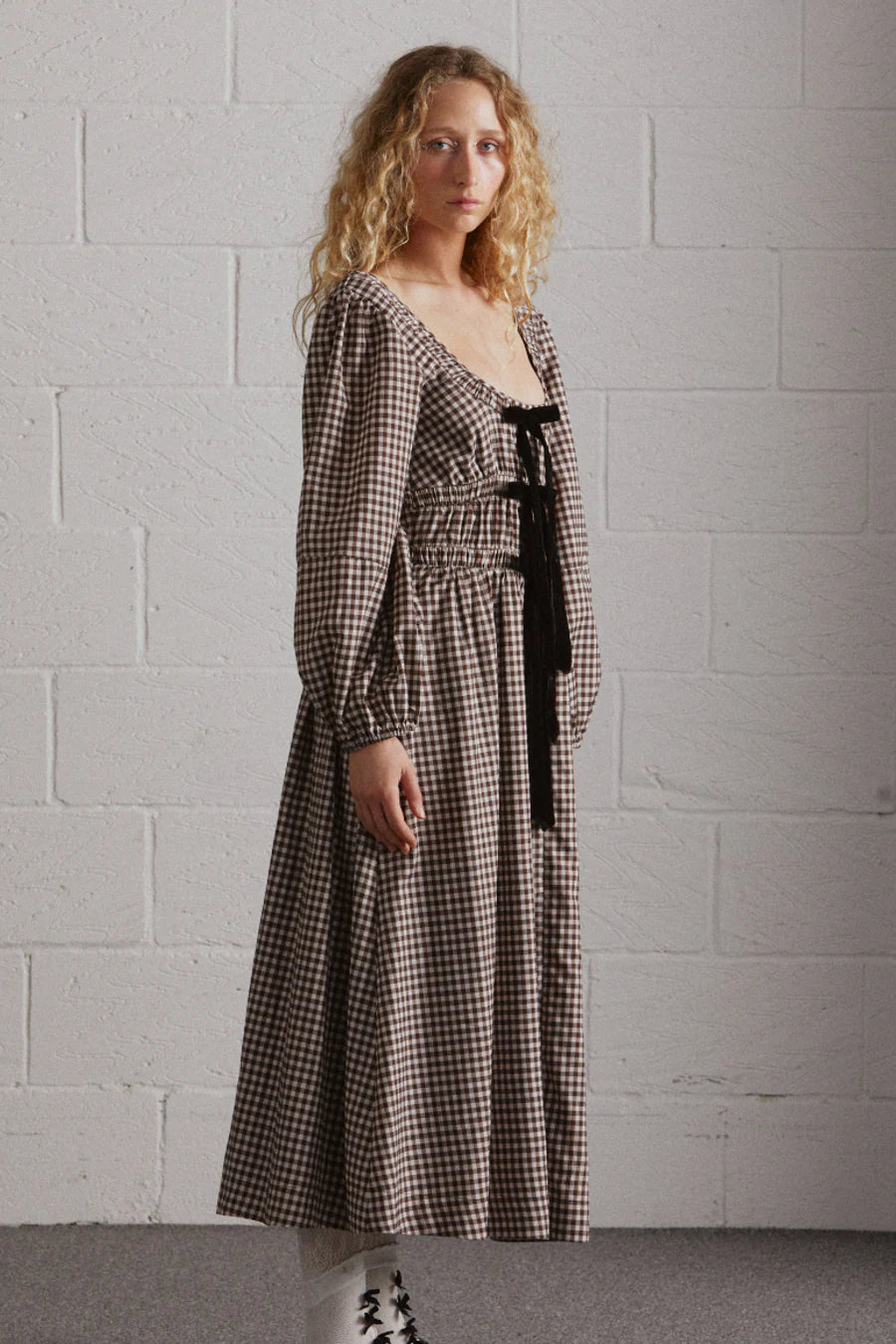 Our Dakota dress is our long sleeve all over check design midi dress featuring puff sleeves. a scoop neckline and front black bow styling.