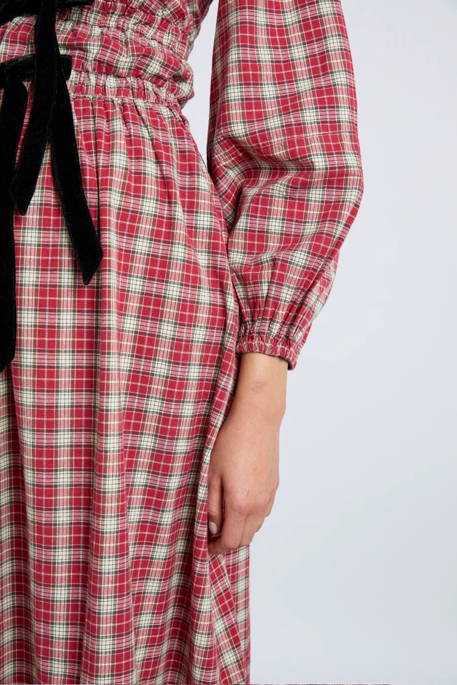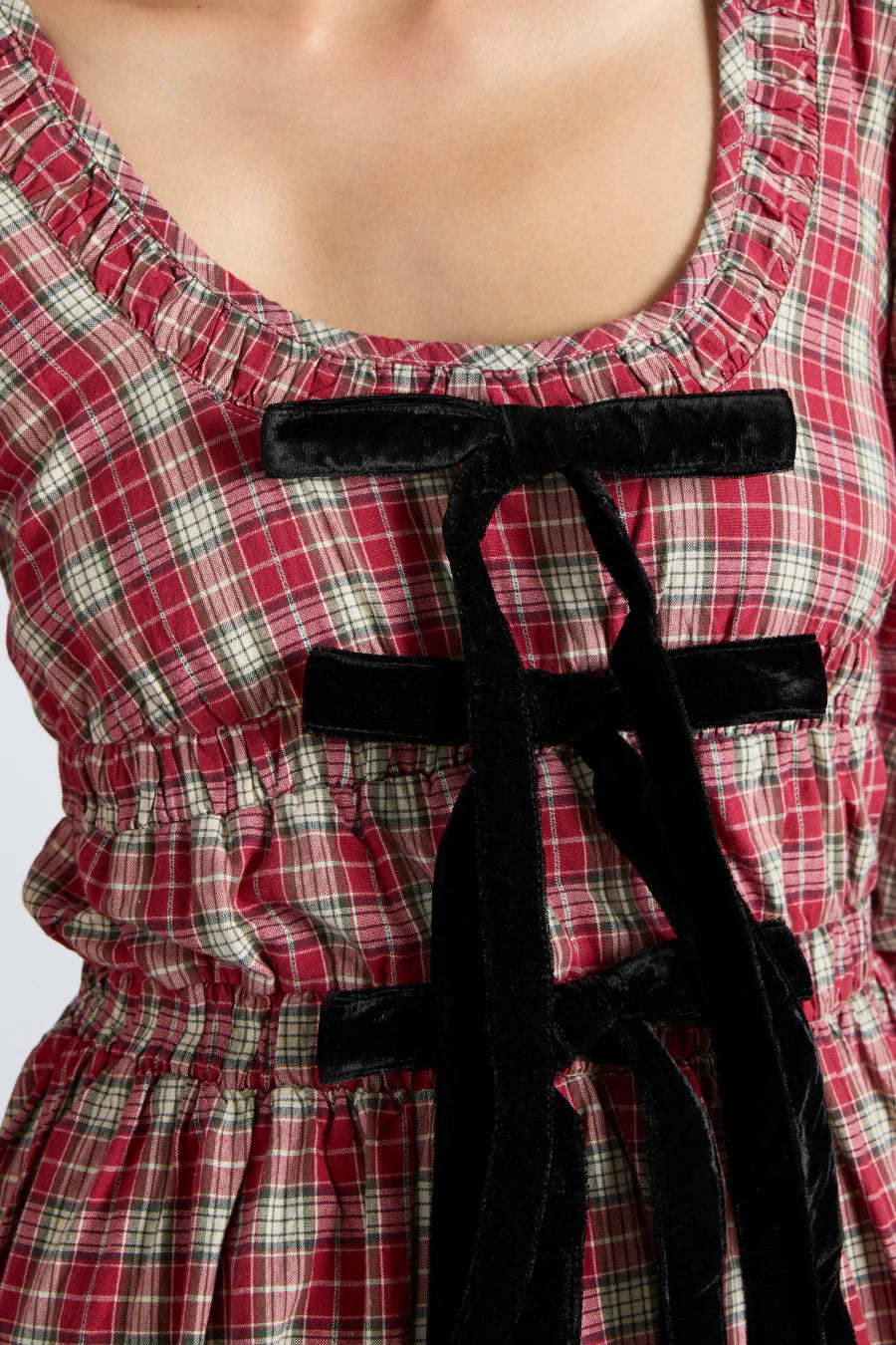 Fronted with three velvet bows and made from organic cotton. we present our Dakota midi dress in tartan.