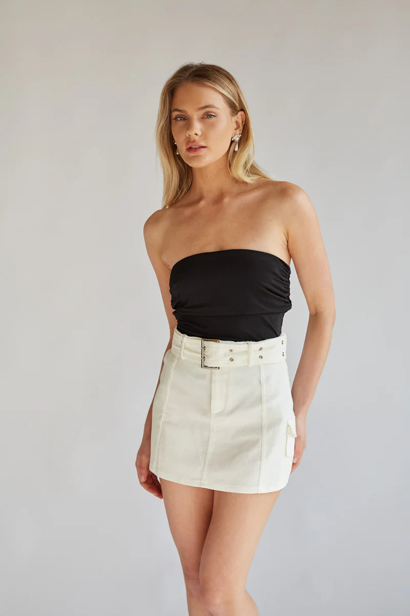 You'll be giving ultimate "cool girl" vibes in the Darcey Belted Cargo Mini Skirt! This cargo-style mini skirt features a detachable belt with a silver belt buckle, silver grommets, and a mini side pocket. Available in white, black, and tan. Pair with a cute to complete the look!