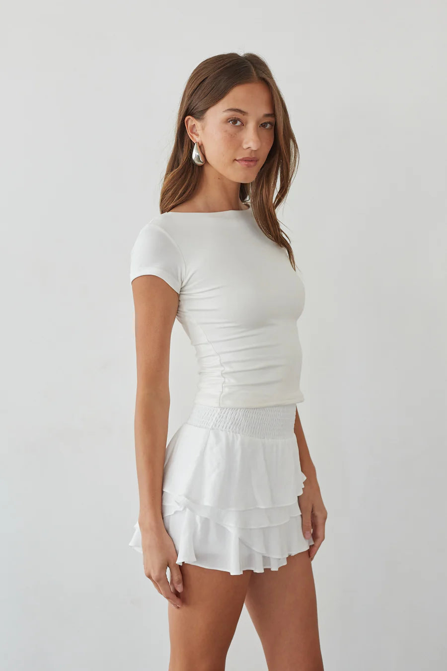 Keep it cute in the Daytona High-Rise Tiered Ruffle Skort! Featuring a high rise fit, a smocked waist, and layered ruffle detailing for a flouncy silhouette. Available in white. Pair with the for a flirty final touch.