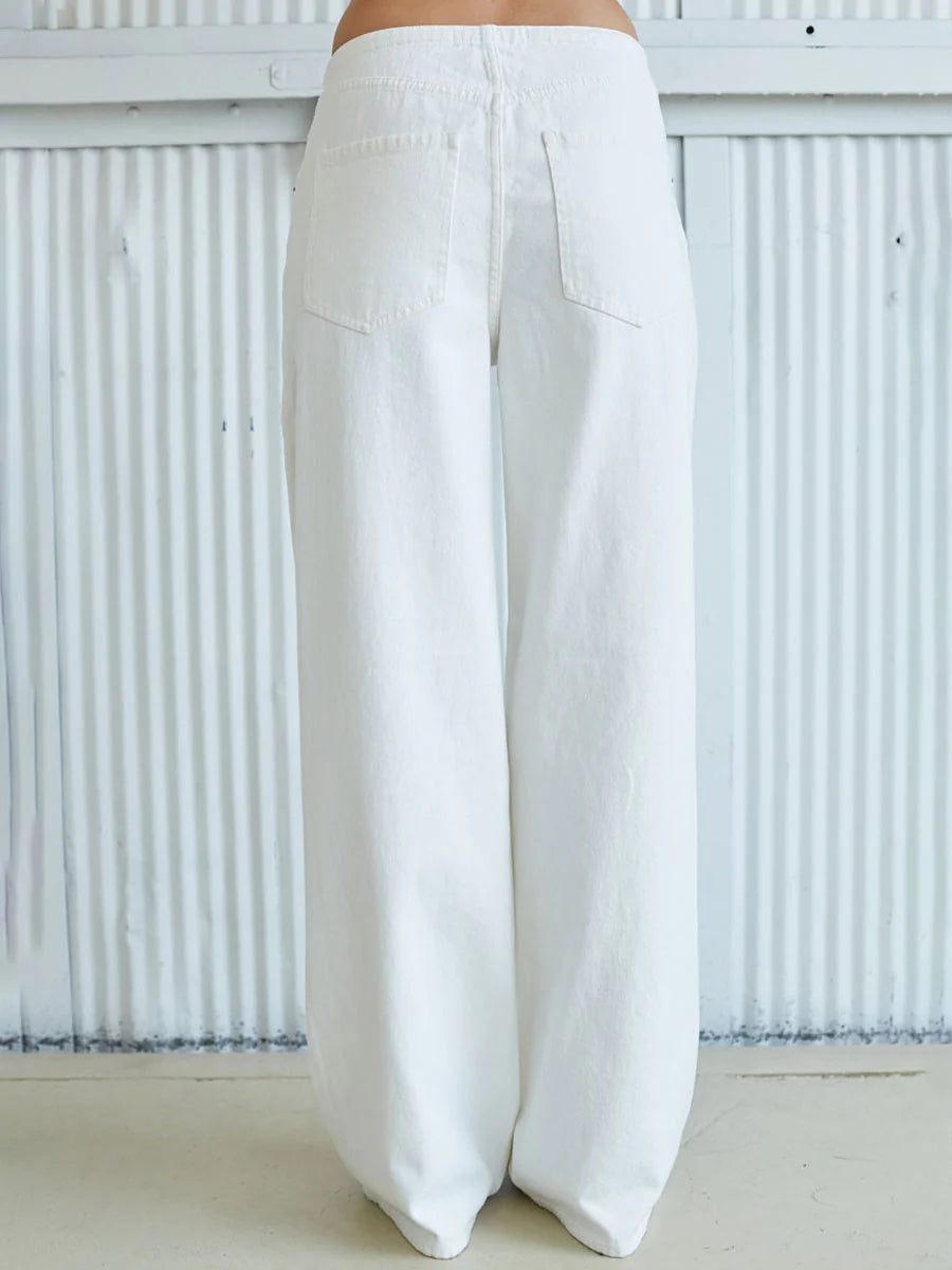 All tied up. The Madison in Milkshake is the perfect relaxed jean. The mid-rise fit is tied together with a drawstring waist, and the wide leg fit features a cream wash. Constructed from our rigid 100% cotton fabric for a true denim feel.