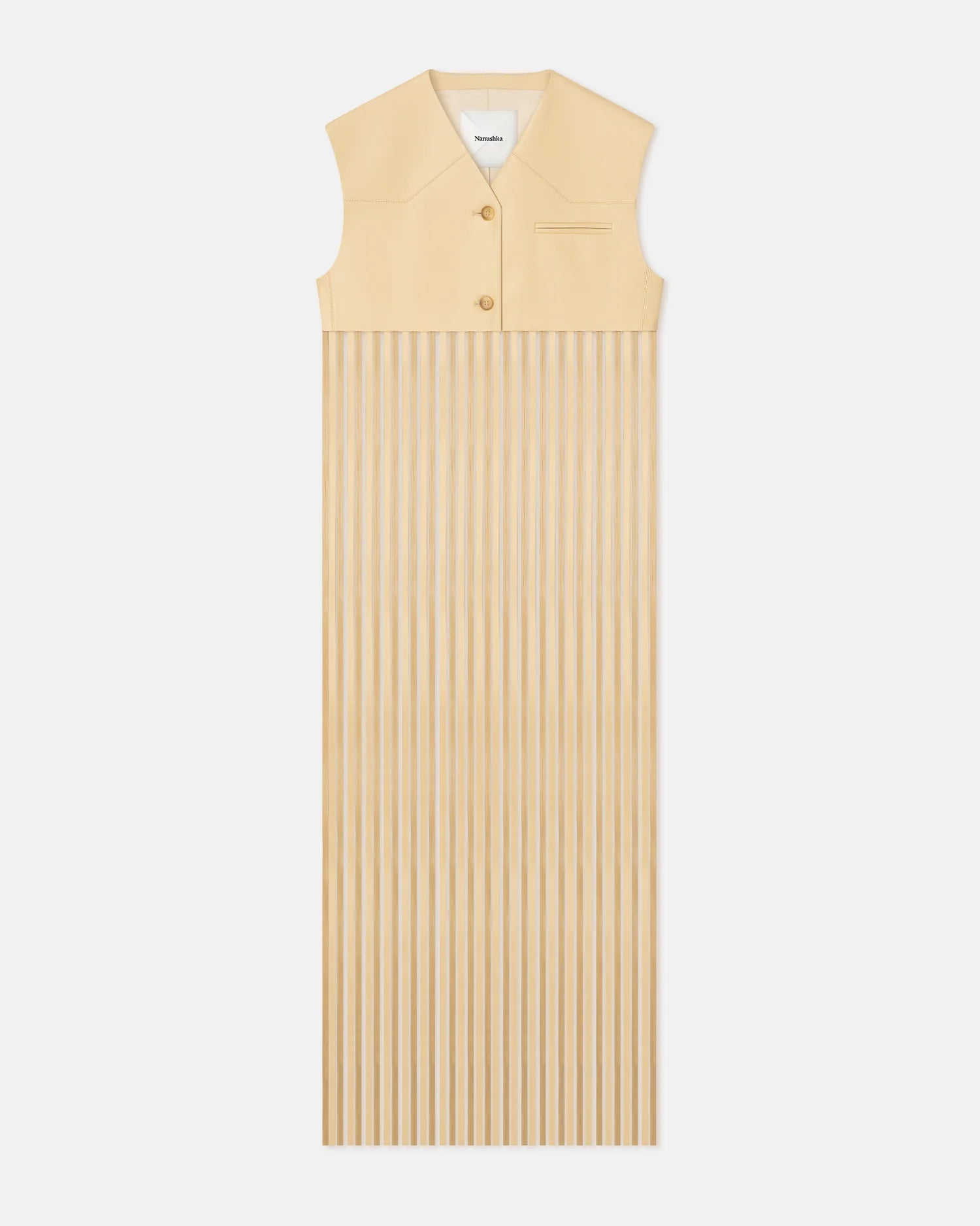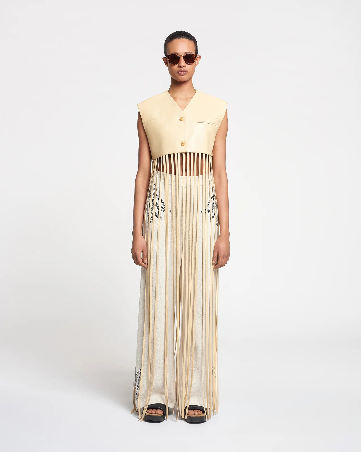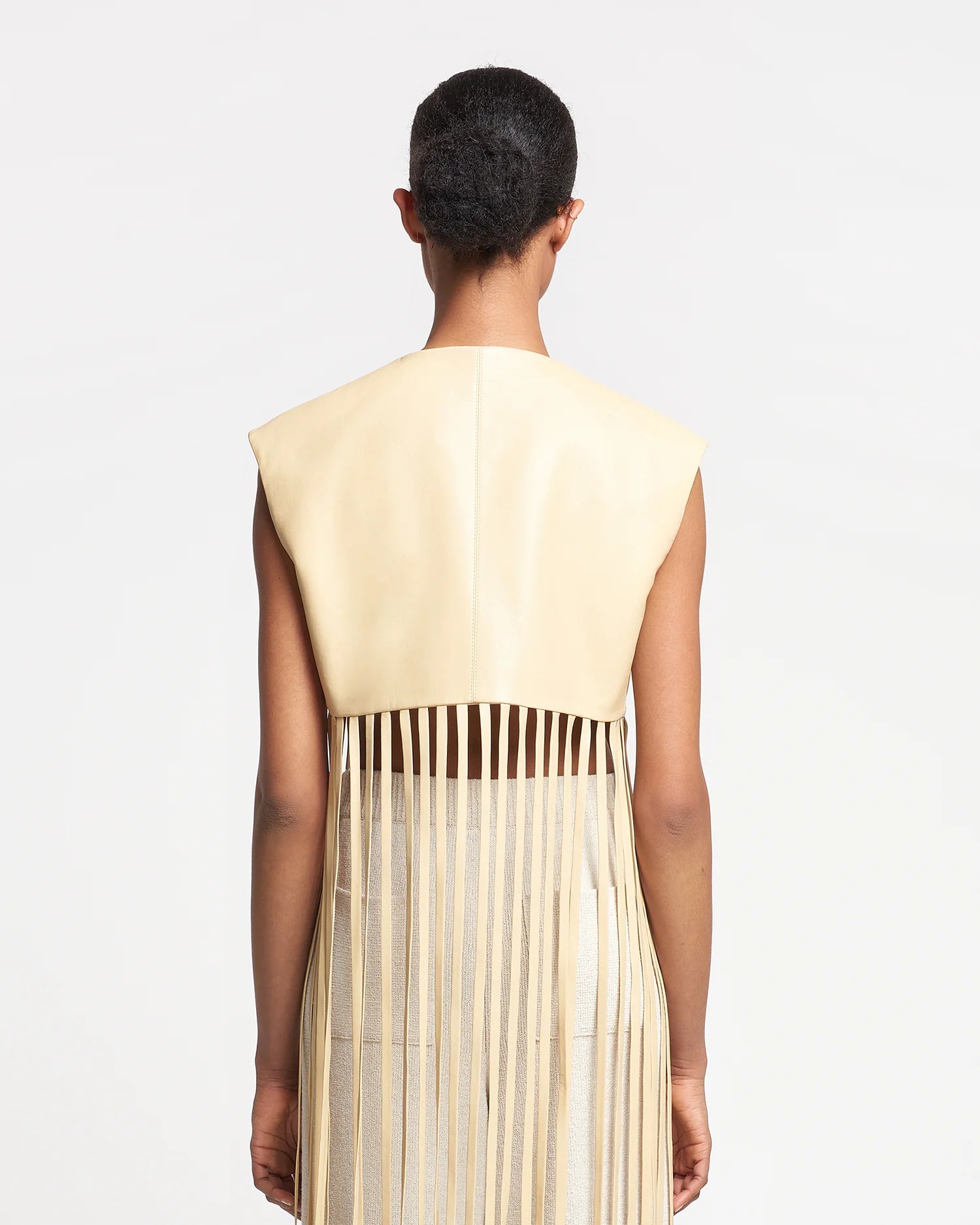 The Derora vest has a chest welt pocket and button fastenings above the cropped silhouette. Made from regenerated leather. it has a wave of swishy fringing inspired by classic Western style aesthetics.