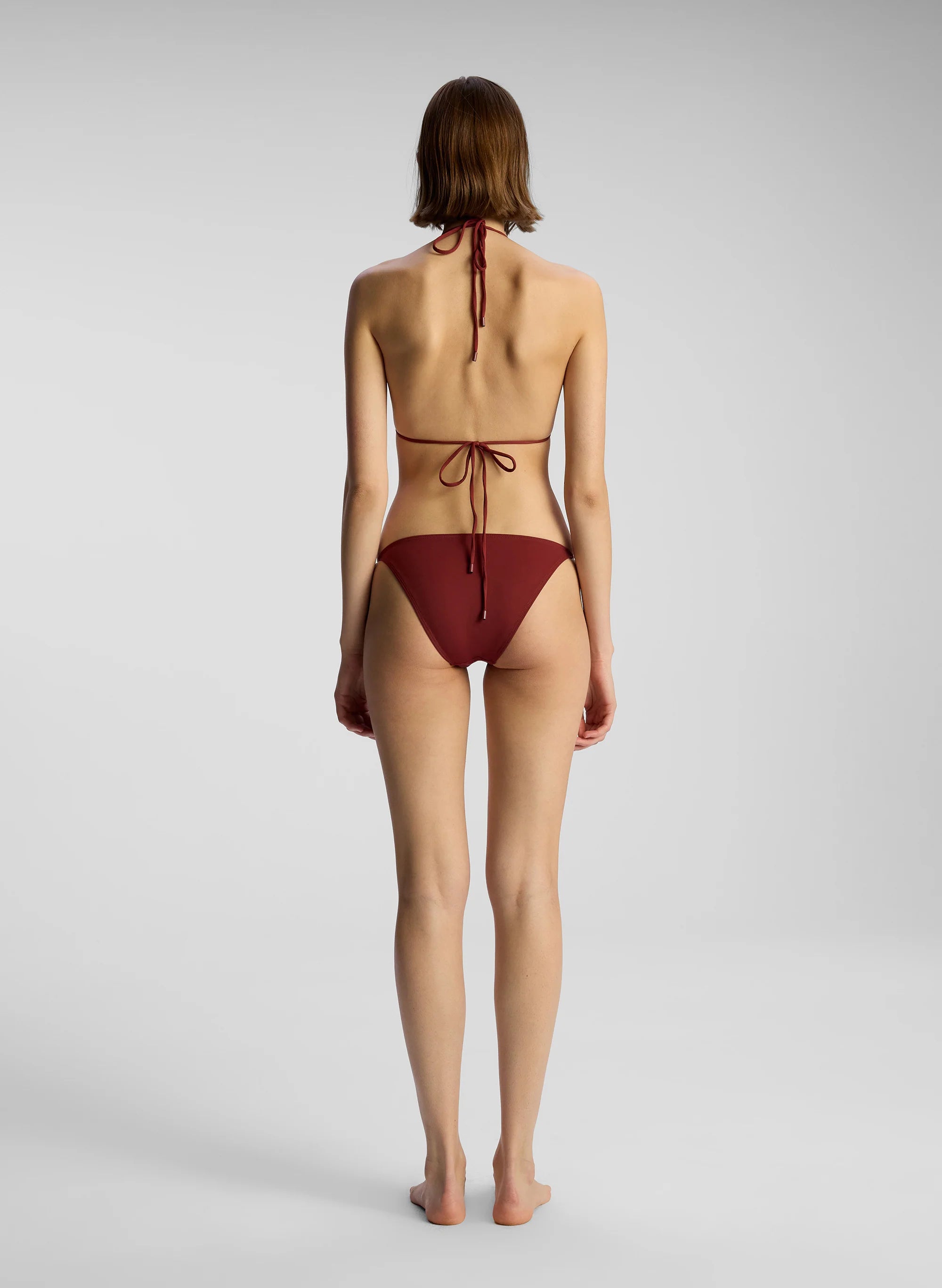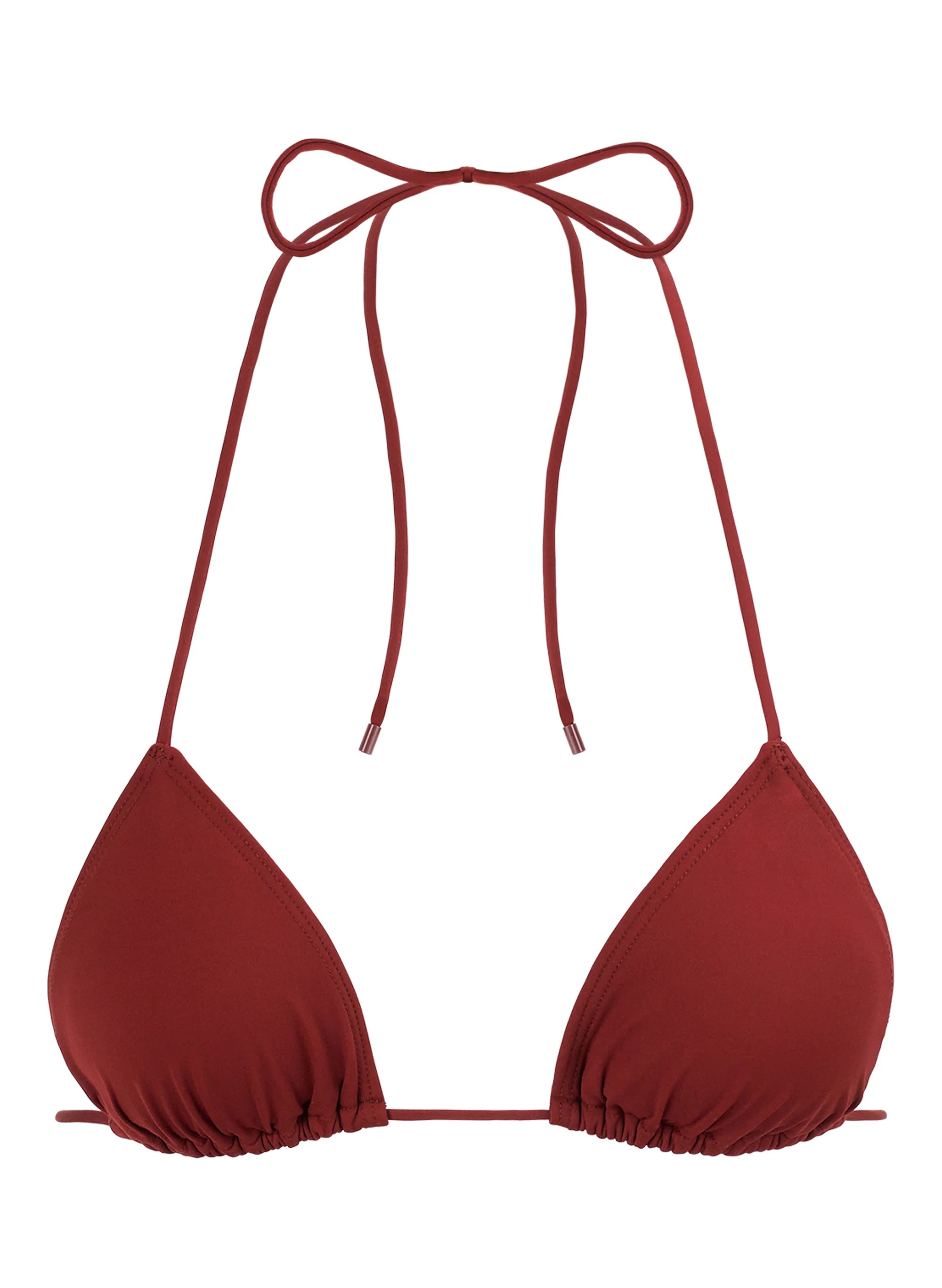 The Devin Bikini Top in a syrah hue is crafted from our structured and fade-resistant swim fabric sourced from Italy and made in the USA. with incredible stretch and recovery. It features traditional triangle cups and string ties for a classic two-piece look. This style runs true to size. Shop Swim.