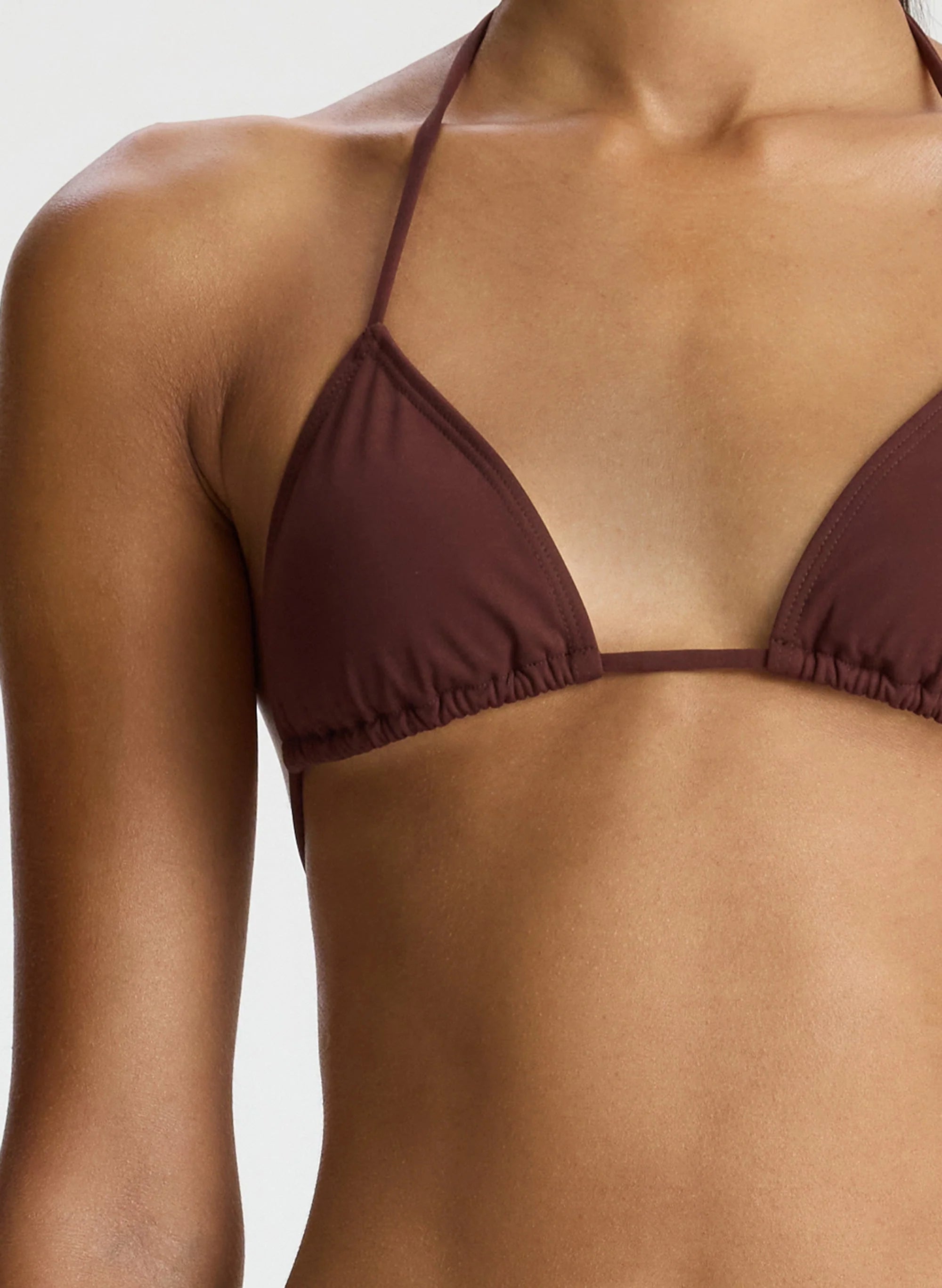 The Devin Triangle Bikini Top is crafted of sculpting stretch fabric in a chocolate brown hue. It features traditional cups and string ties for a classic two-piece look. This style runs true to size. Shop Swimwear