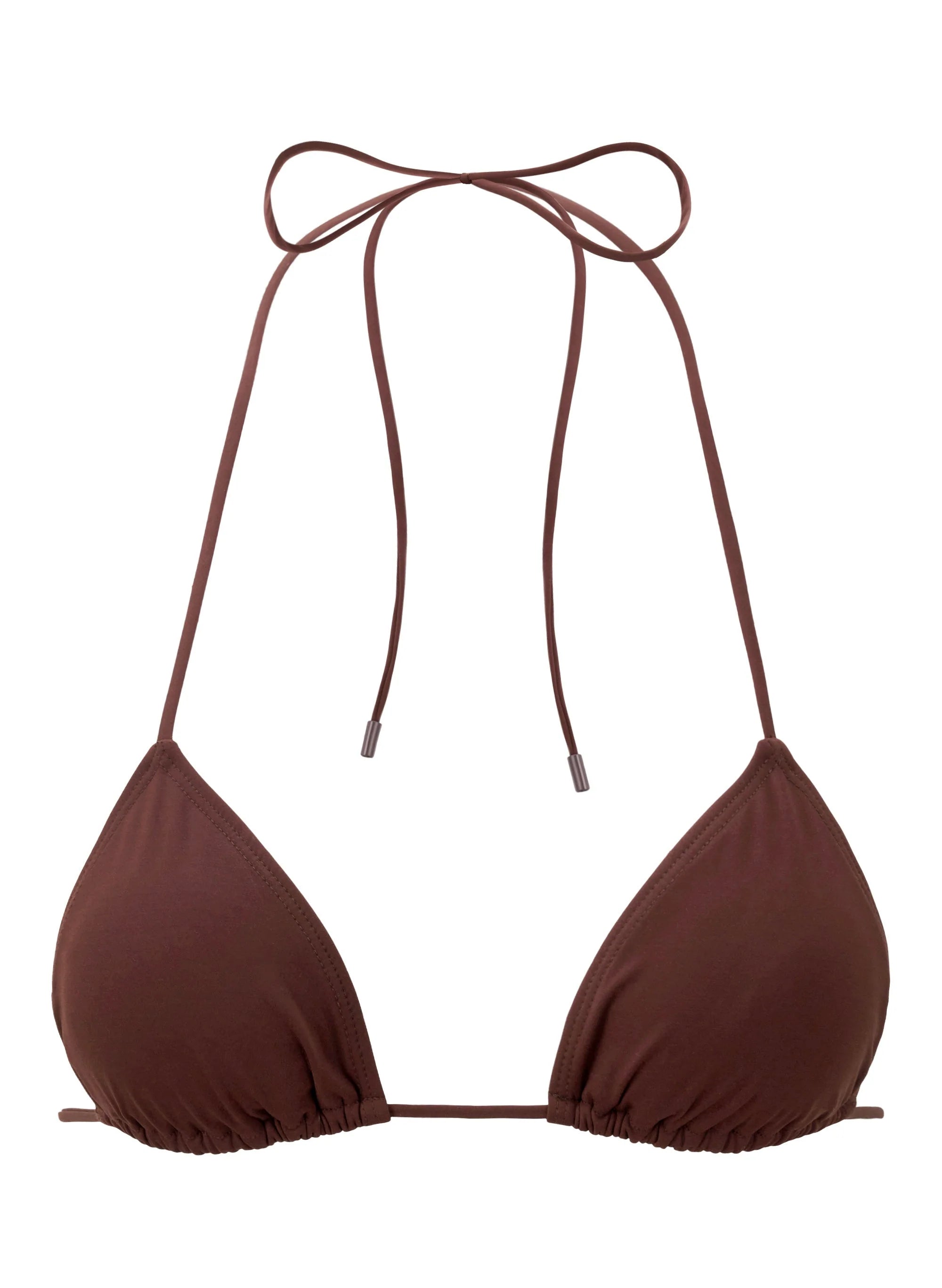 The Devin Triangle Bikini Top is crafted of sculpting stretch fabric in a chocolate brown hue. It features traditional cups and string ties for a classic two-piece look. This style runs true to size. Shop Swimwear