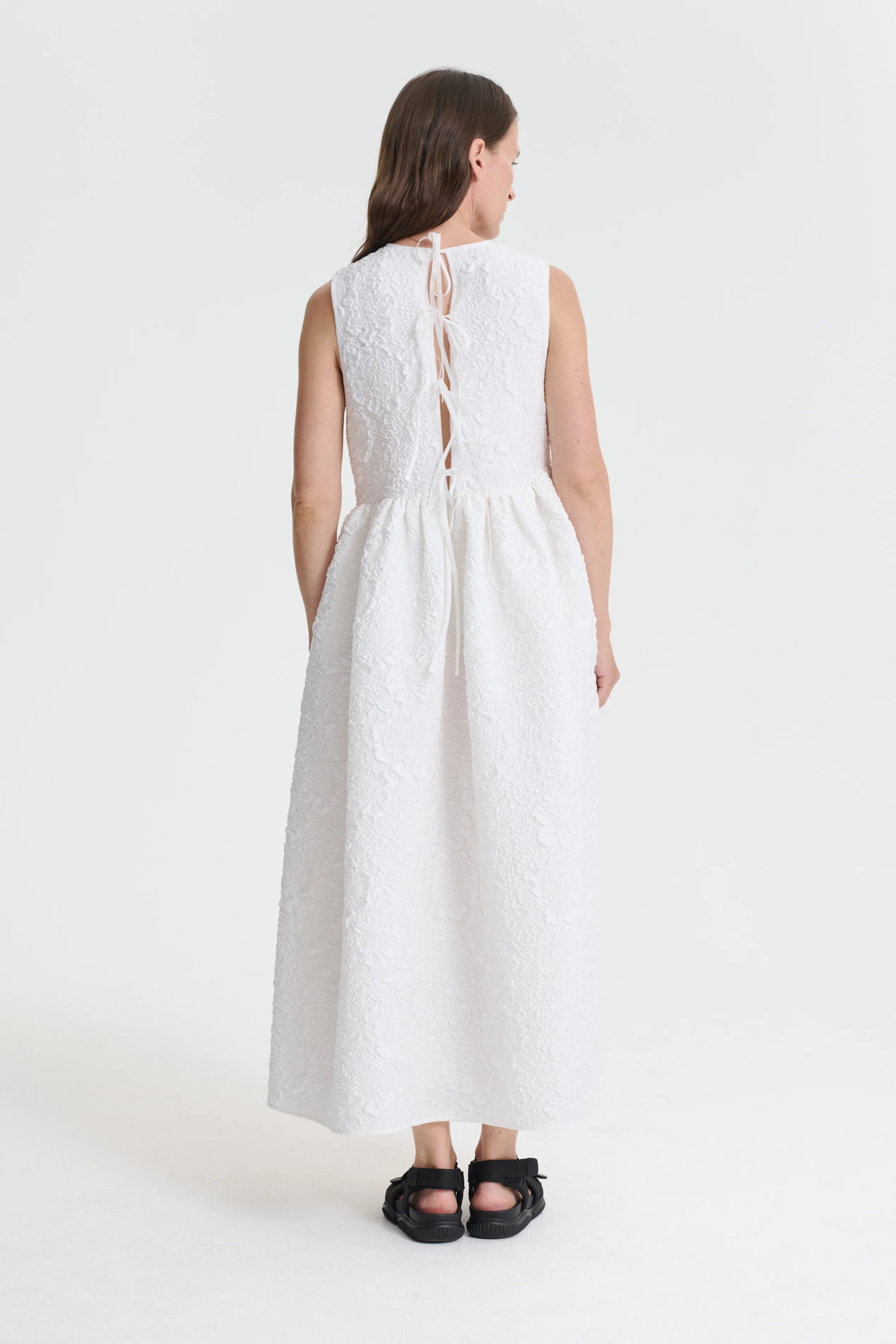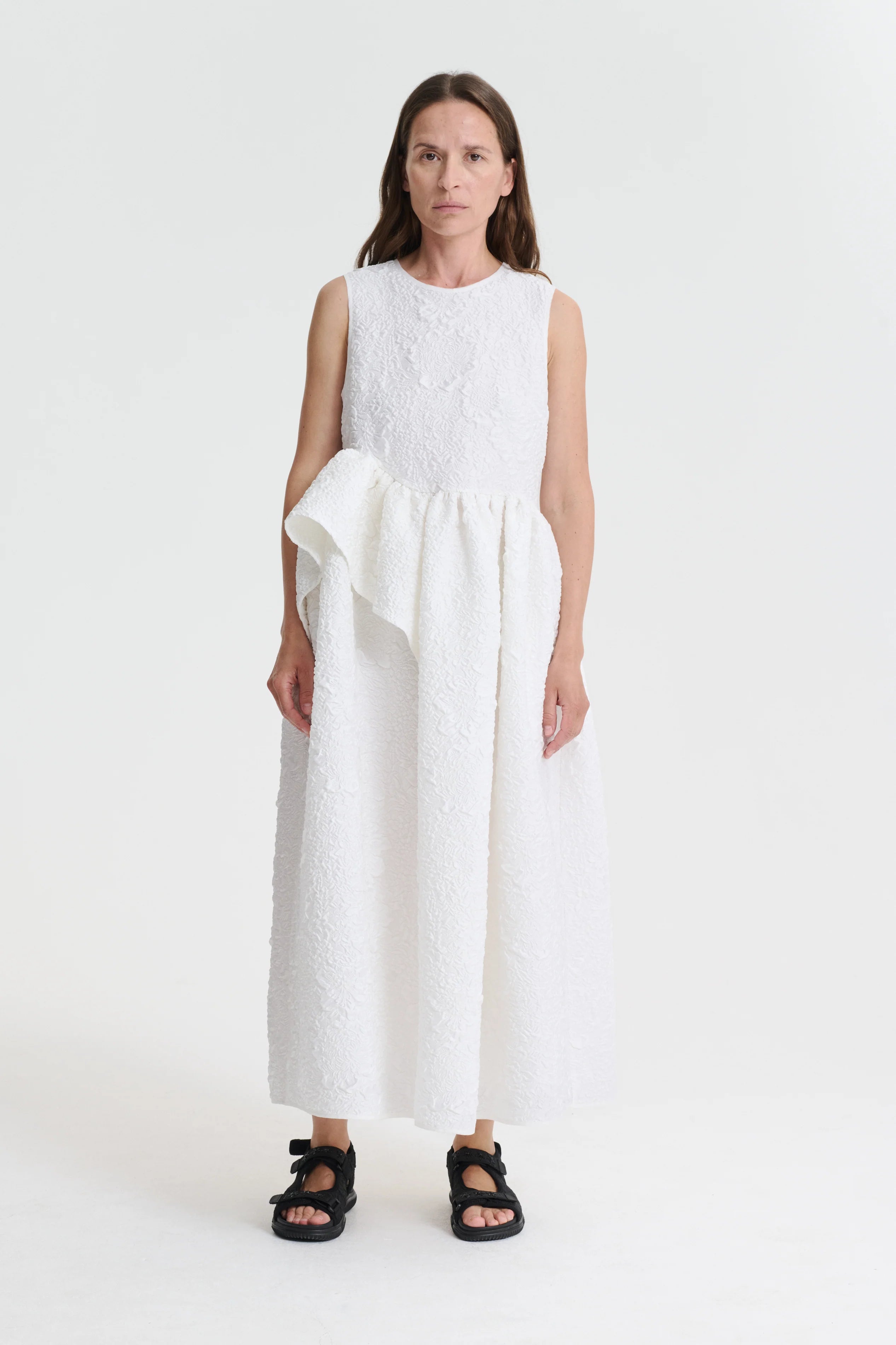 Expanding on a signature silhouette in a romantic white borage cloquÈ. the Ditte dress. The ankle-grazing piece features a classic dropped waistband and asymmetrical ruffle decorating the full skirt. Meeting the needs of function and volume. pockets add another dimension to the dress.