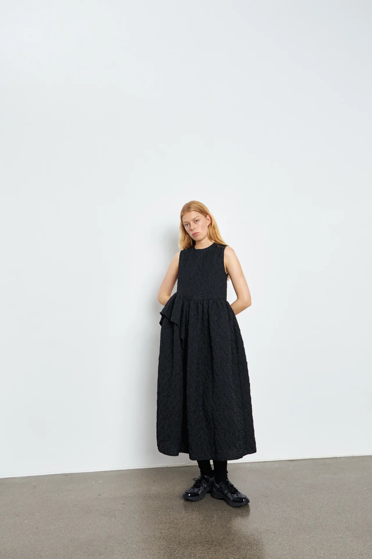 Expanding on a signature silhouette in a tactile grappolo matelassÈ. the Ditte dress. The ankle-grazing piece features a classic dropped waistband and asymmetrical ruffle decorating the full skirt. Meeting the needs of function and volume. pockets add another dimension to the dress.