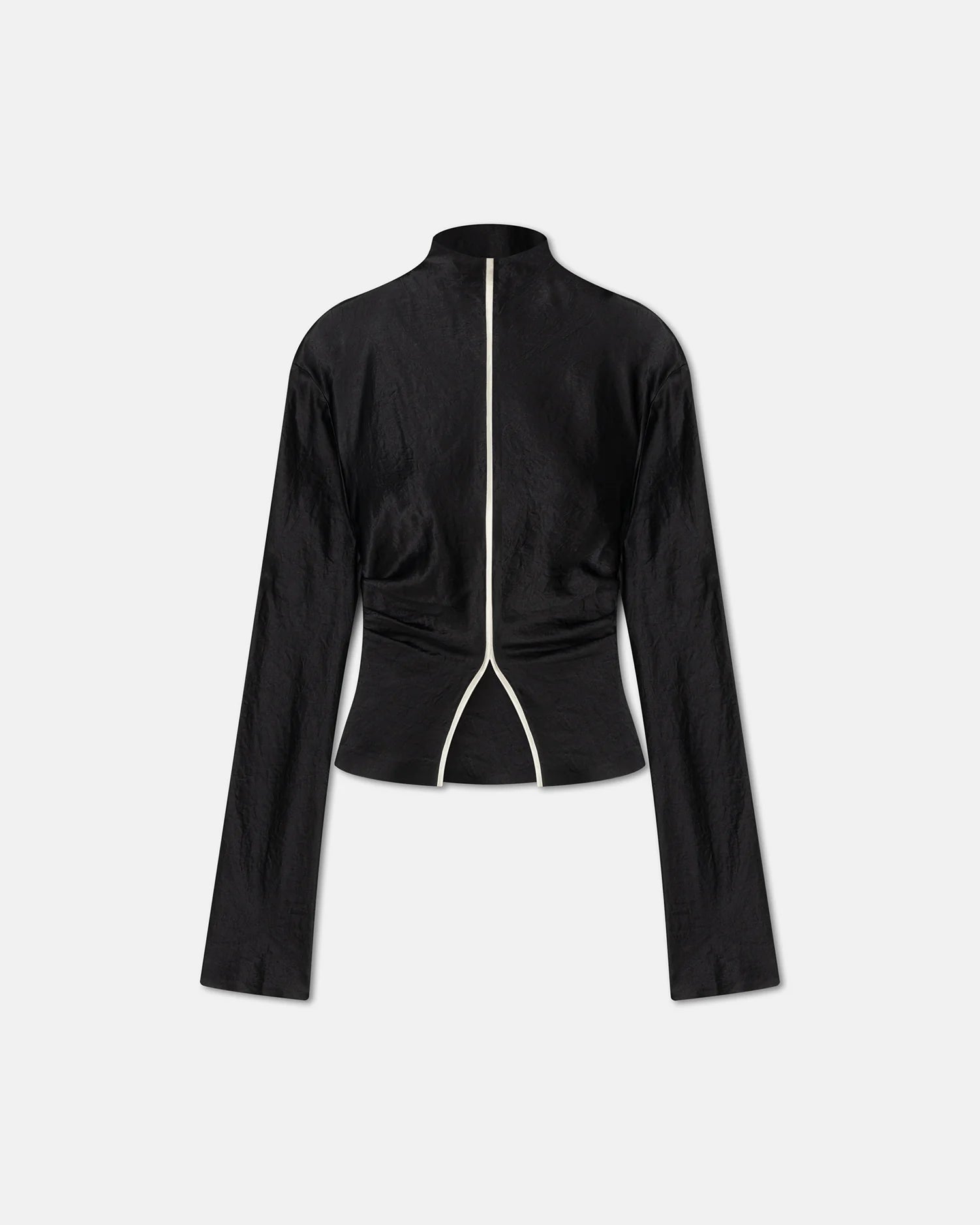 Innovative textures are one of our key design features. The Domini top is made from black crinkled satin that drapes beautifully at the waist. The contrasting ecru binding outlines the sleek silhouette.