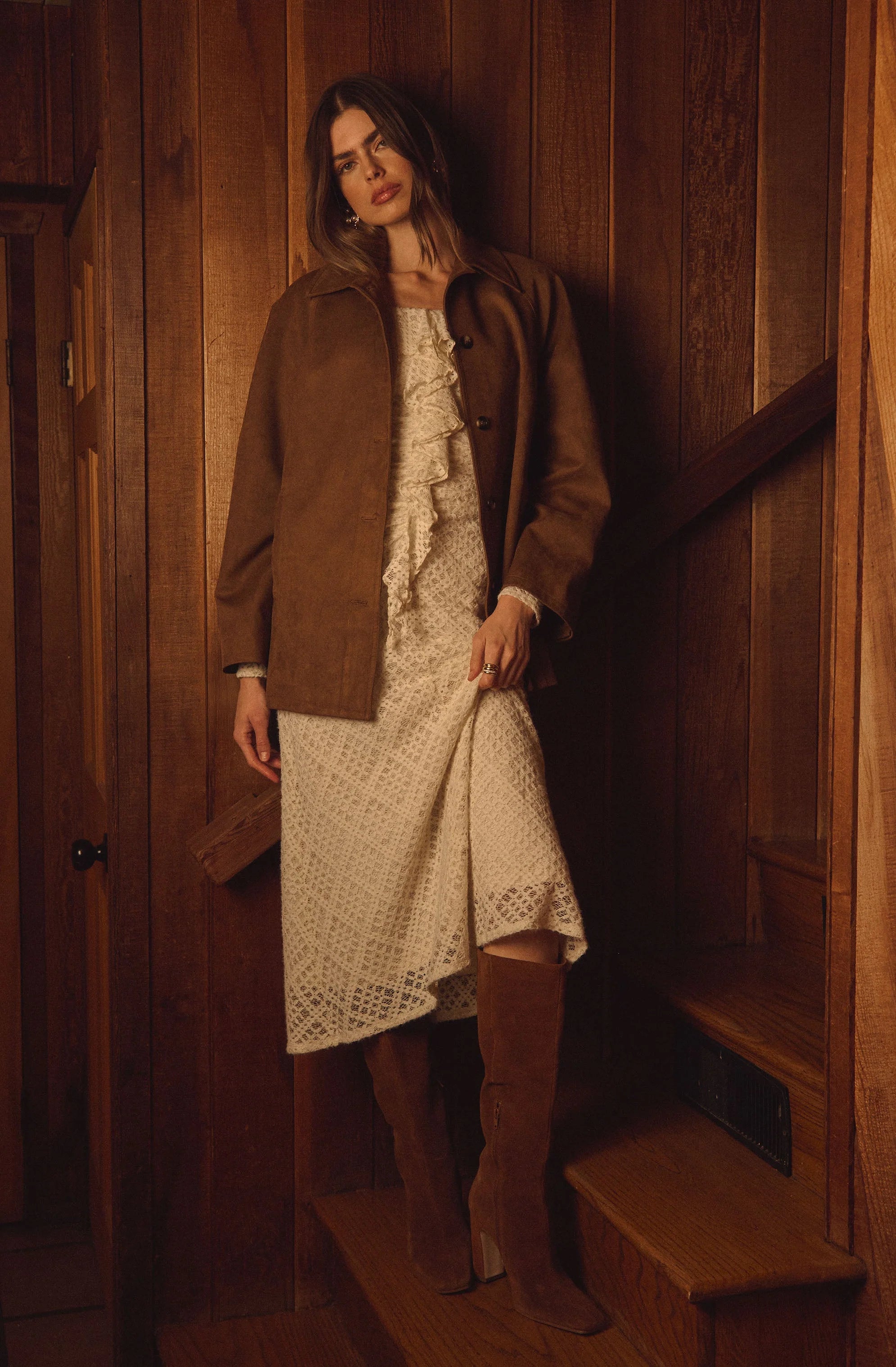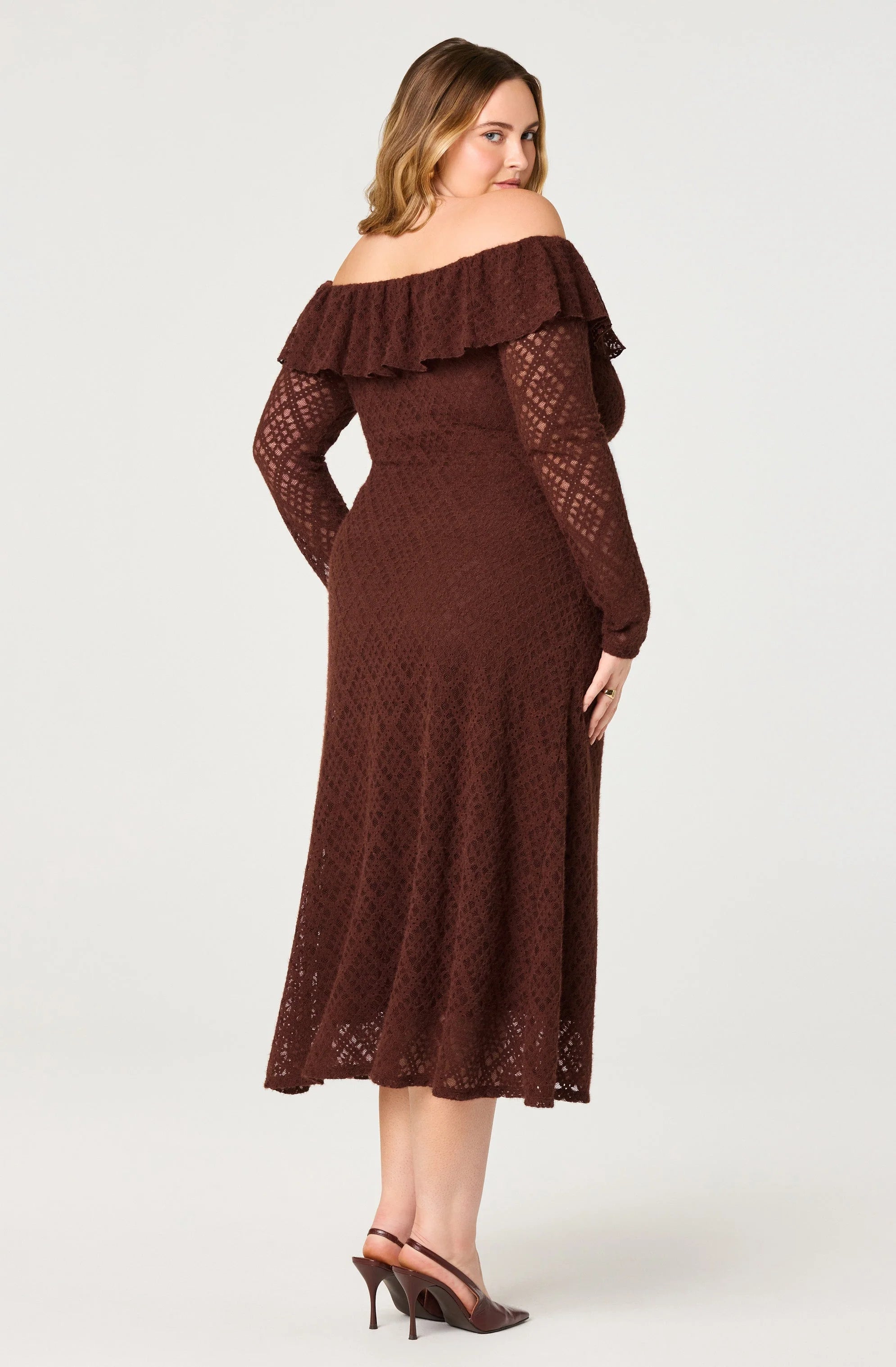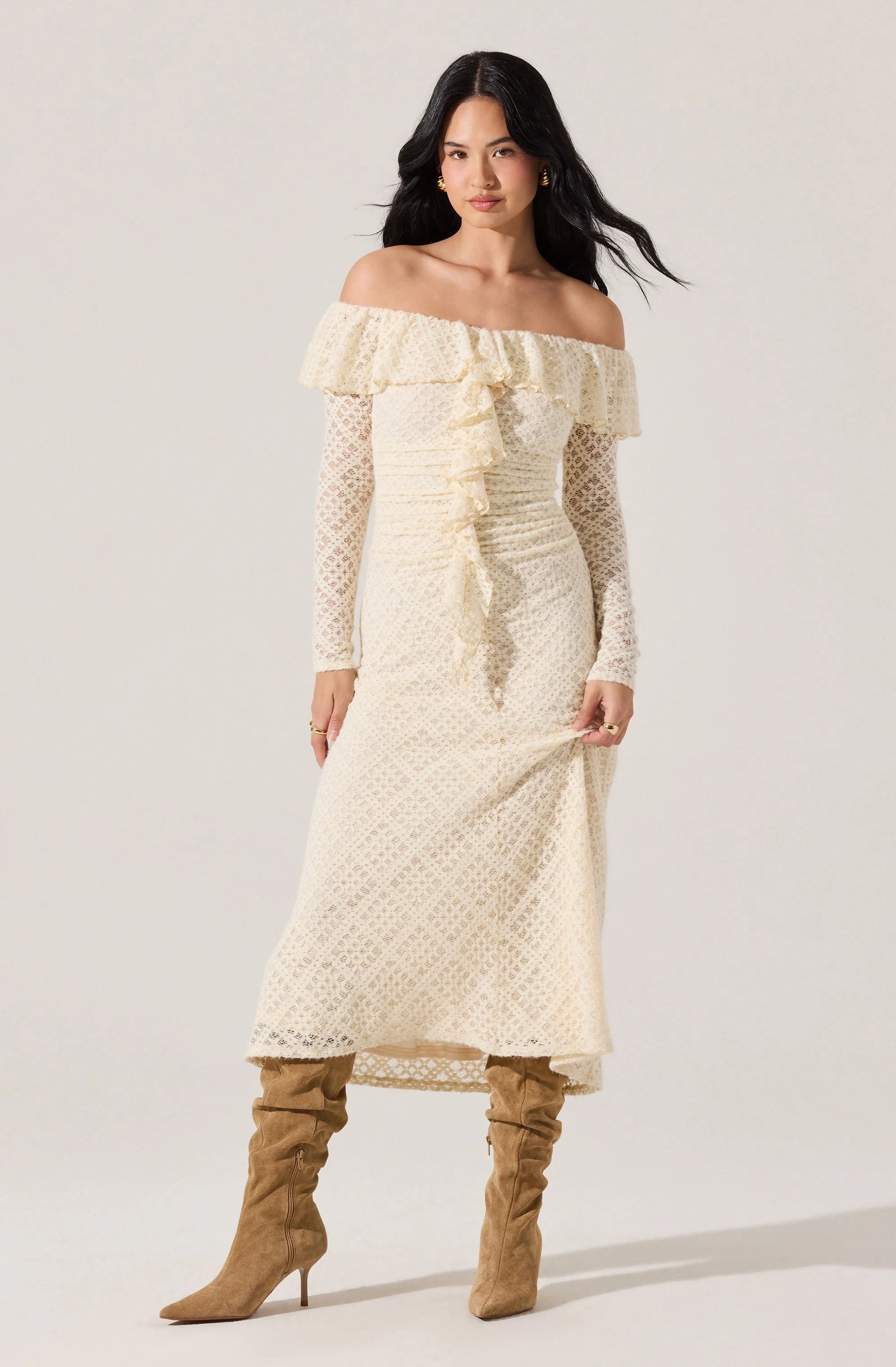 With delicate lace and ruffle detailing, this off-shoulder dress was made for celebrations and evening plans.