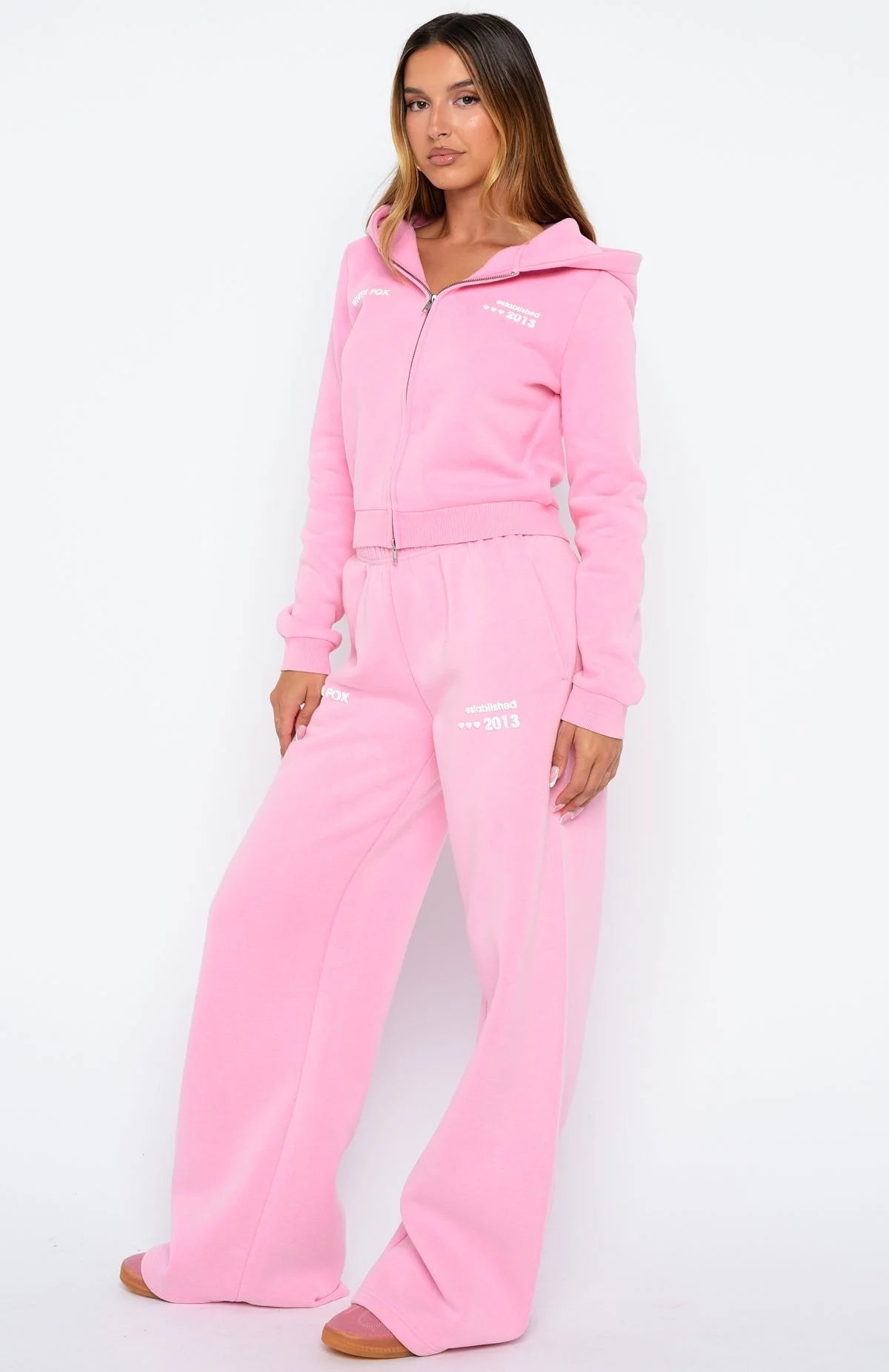 Your new go-to for laid-back luxe. The Down For Whatever Wide Leg Sweatpants Pink Wash is designed with a thick elasticated waistband featuring an internal drawstring tie, side pockets, and a wide-leg silhouette. The White Fox embroidered text at the side adds a signature touch, while the unlined fleece interior ensures a cozy feel. Style with the matching Hoodie in Pink Wash!