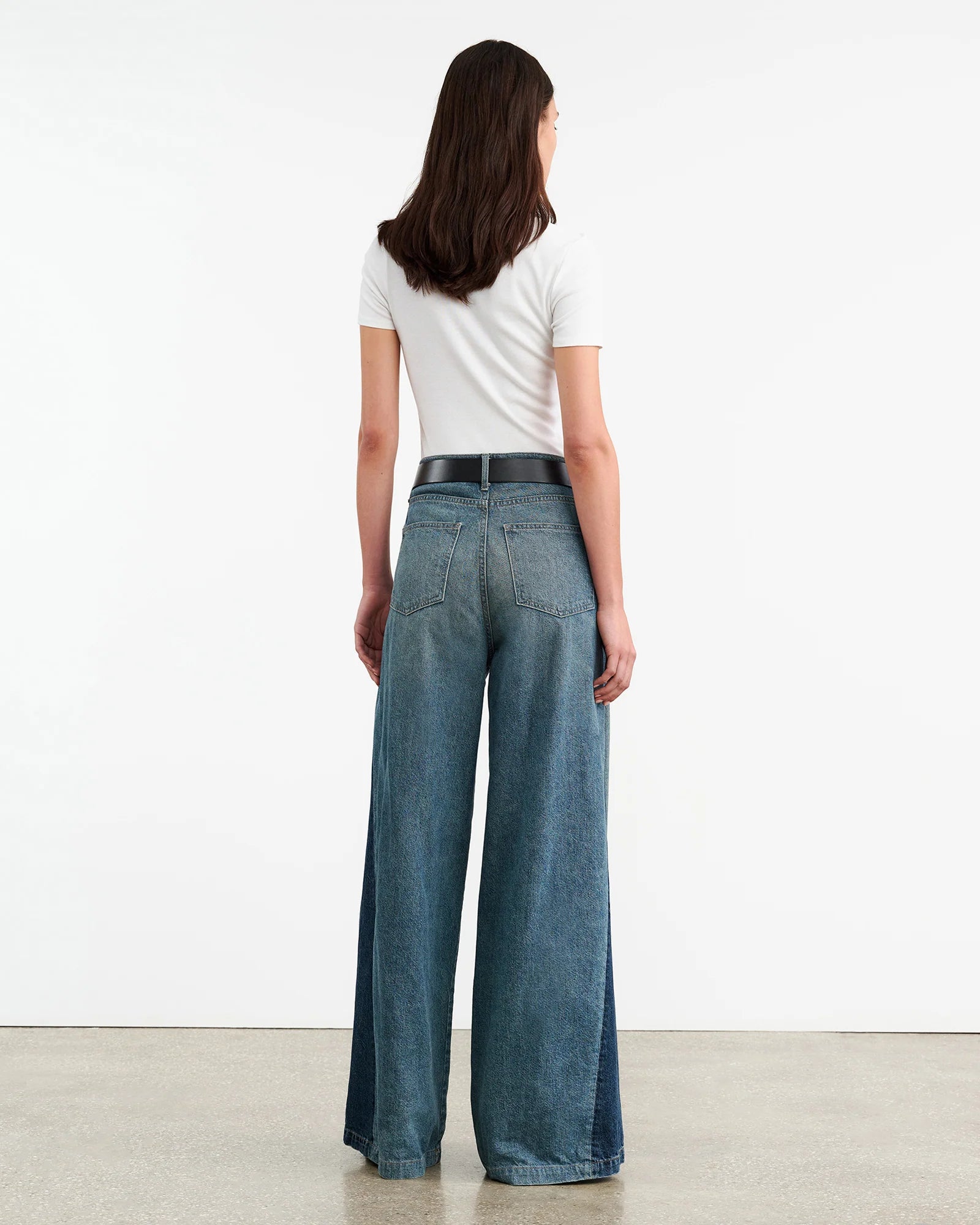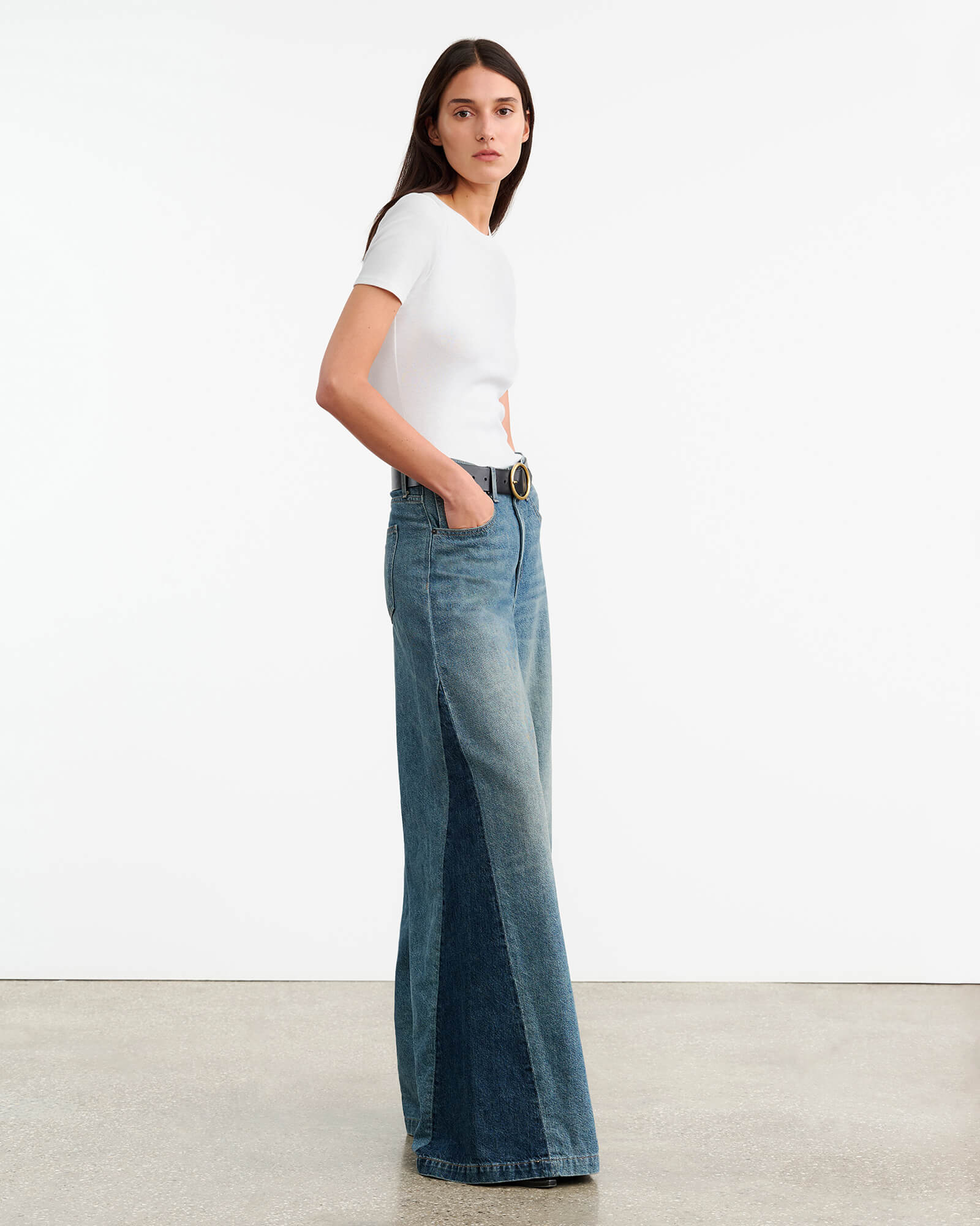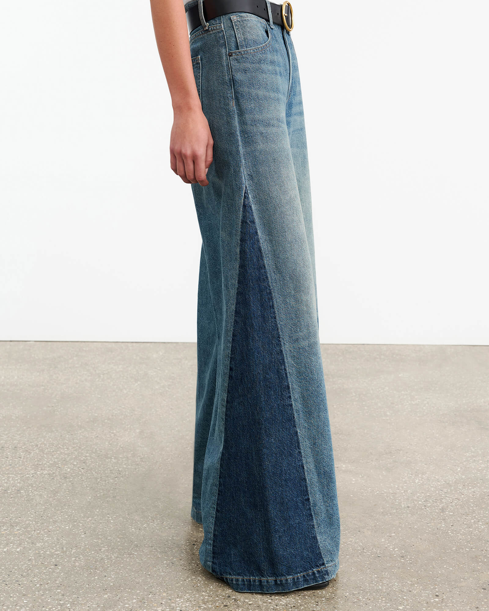Mid-rise wide flare leg jean in Japanese denim. Patchwork insert. Five pocket detail. Zip fly. Shank closure. Belt loops.
